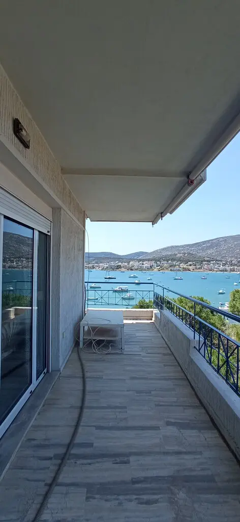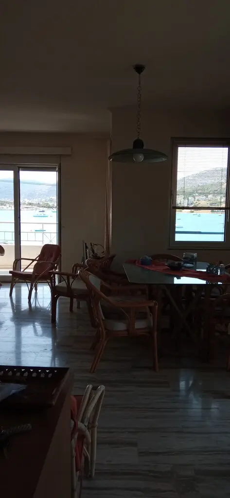 The apartment boasts a corner layout, allowing for an expansive view of the sea from the windows. Notable features include solar panels for heating water, air conditioning for climate control, awnings for sun protection, and a heating system for colder months. Please note that the building does not include an elevator.
