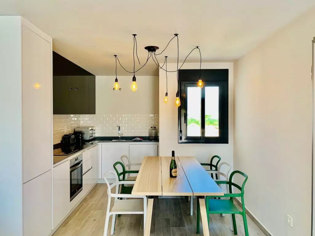 The flat showcases a spacious living and dining area that seamlessly integrates with an open kitchen, making it easy to entertain or relax. Right next to the living room, a small open terrace provides an additional outdoor space for moments of relaxation. Expand your outdoor experience by taking the stairs to the private solarium, where you’ll find stunning views of the surroundings.