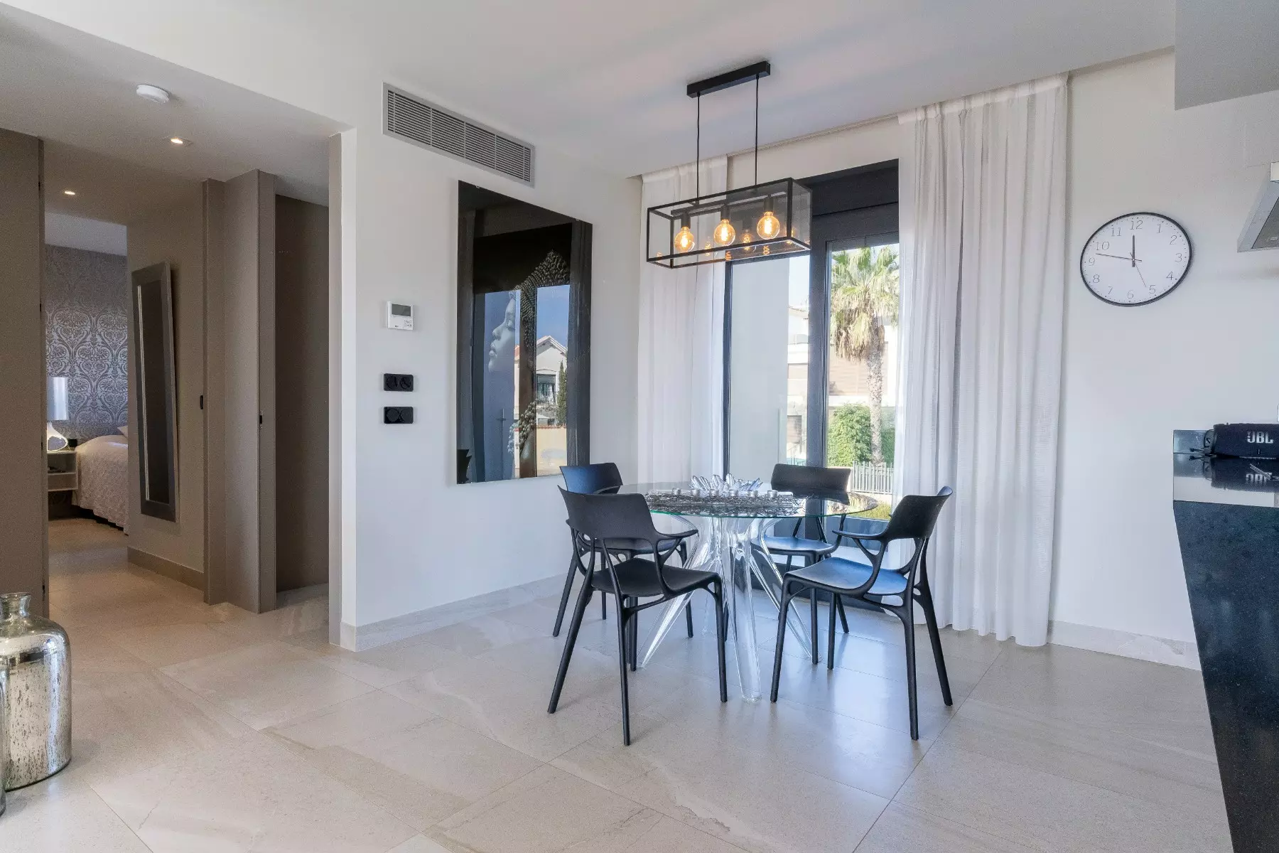 Escape to your outdoor oasis on a sprawling rooftop terrace with stunning 360-degree views of Los Dolses and beyond. This exceptional space includes comfortable seating, a dining area, and lush greenery. It is ideal for entertaining or simply relaxing outdoors.
