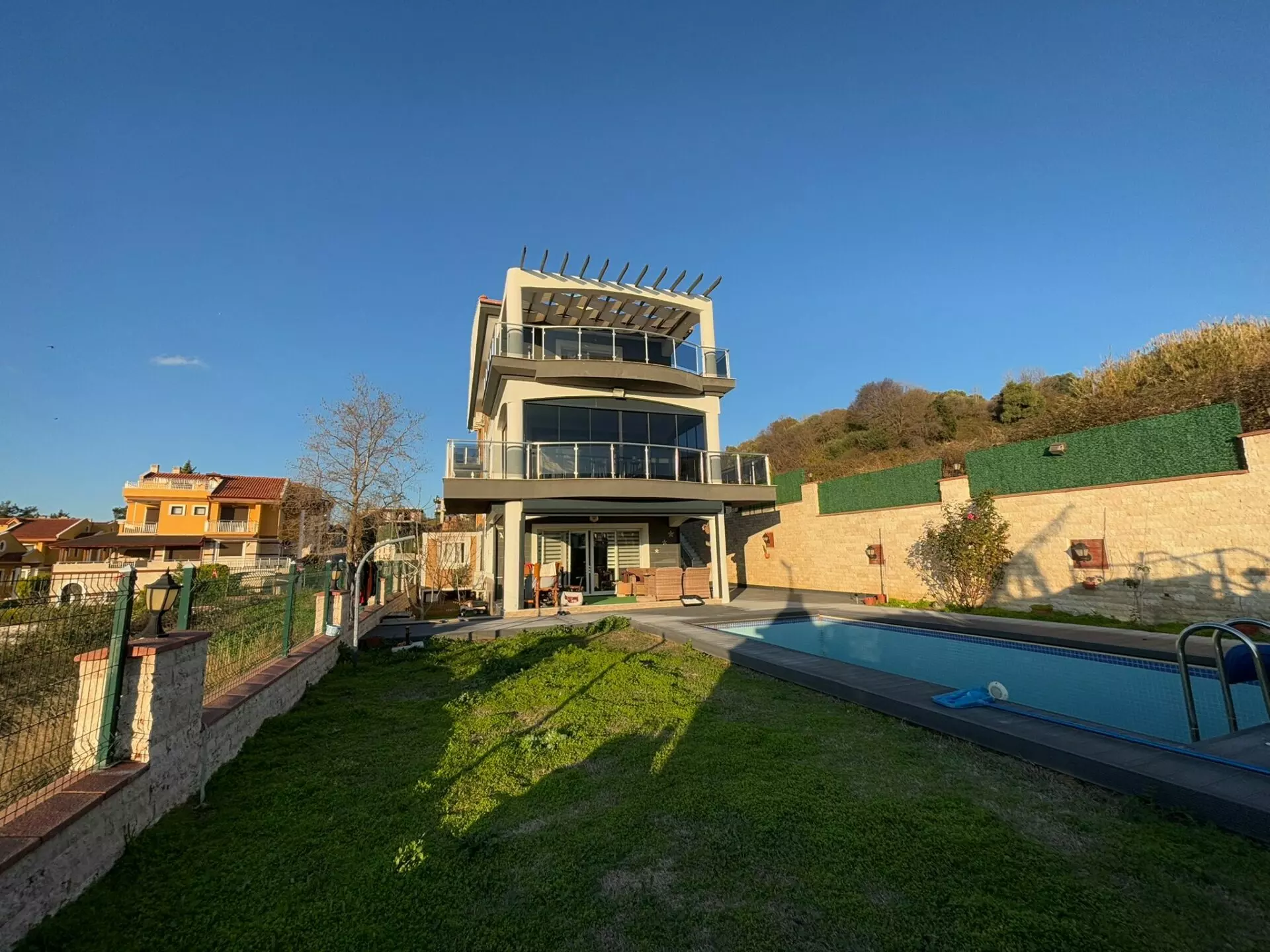 This magnificent 3-storey villa, built on a 450 m² private plot, offers a breathtaking panoramic sea view and is located in the prestigious Soğucak area of Kuşadası.