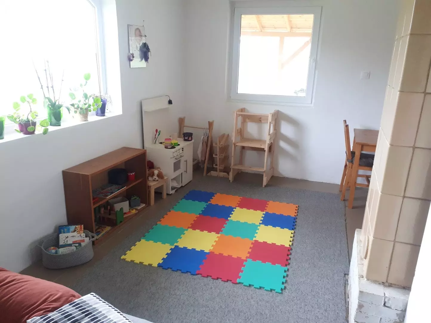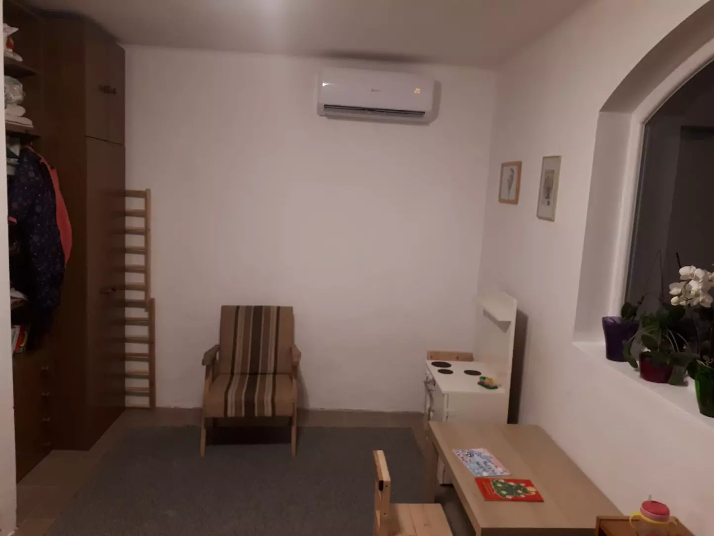 In addition to the air-conditioning units, a ceramic tiled stove is installed on the ground floor, providing supplementary heating.