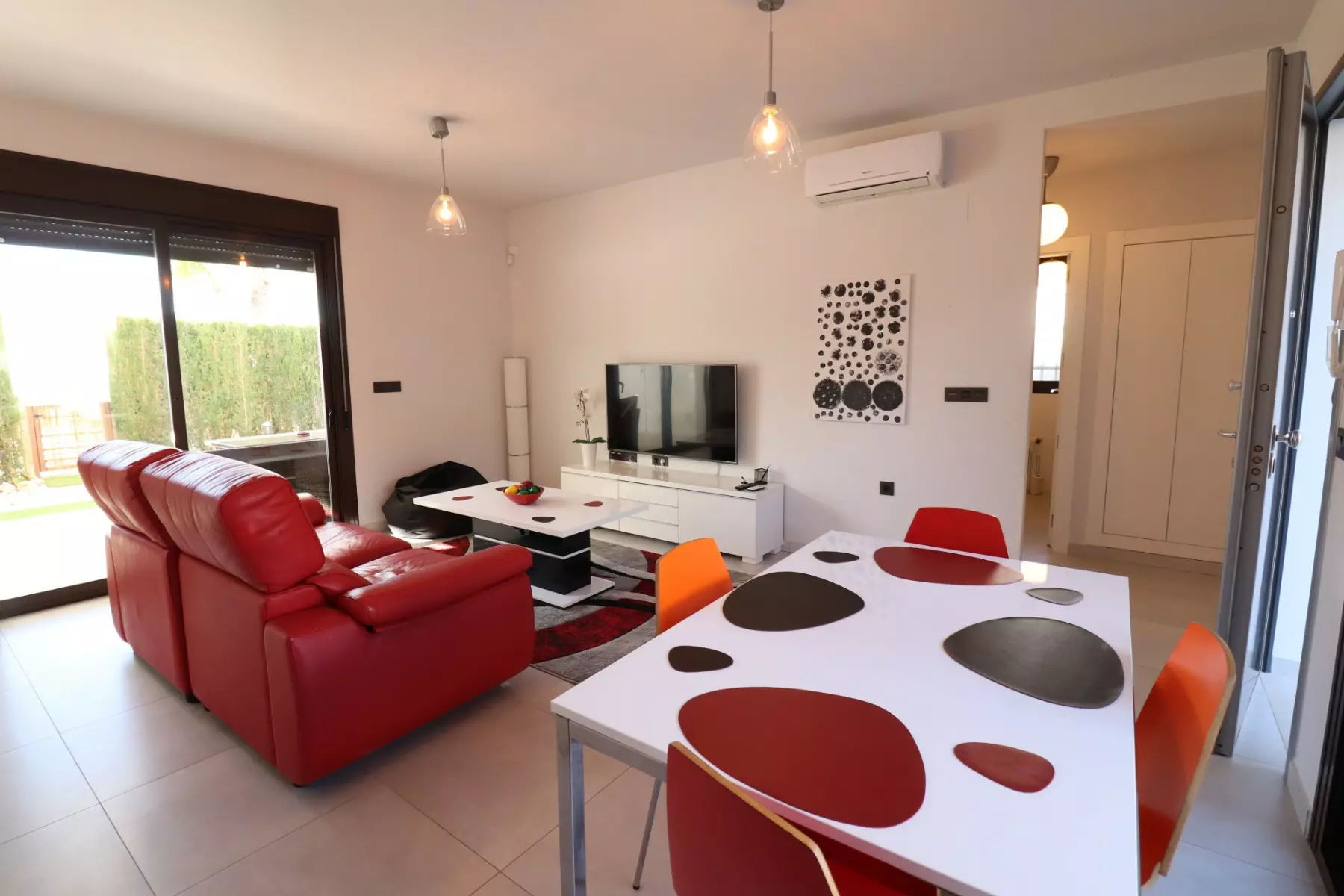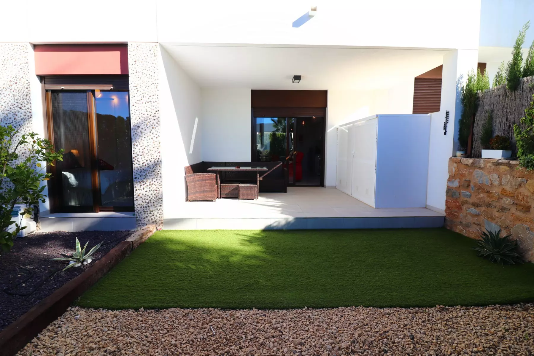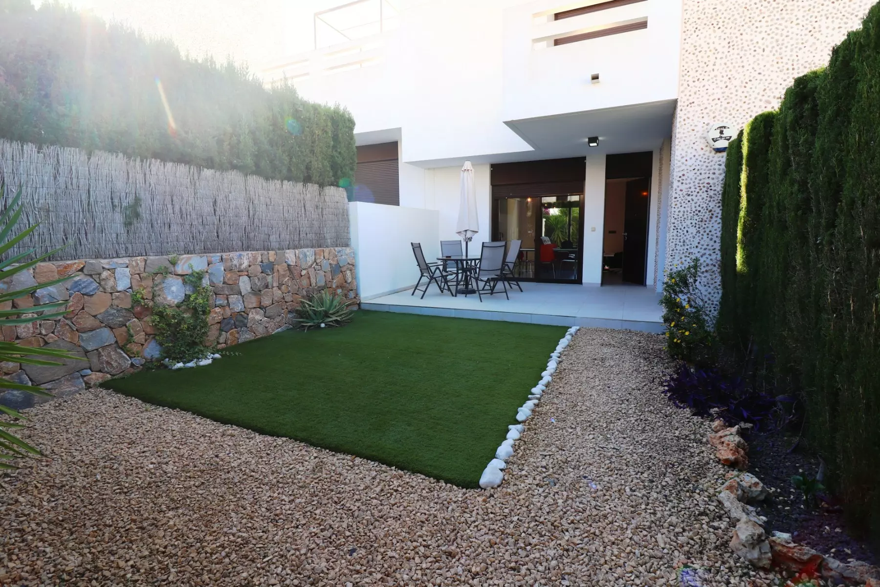 The property features a bright open-plan living space, highlighted by double sliding glazed doors that lead to a rear garden and a covered terrace. There is also a front garden with a partly covered terrace, making outdoor dining or relaxation convenient.