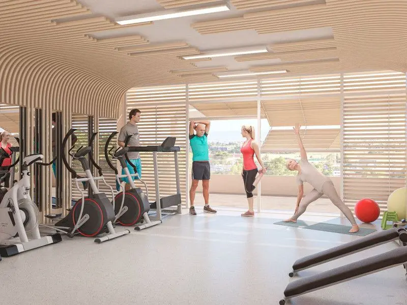 The Albatros XV development features extensive shared spaces. This includes a designated chill-out zone, a gym located on the seventh floor that provides expansive views to complement exercise routines, and a notable rooftop infinity pool positioned on the southeast corner. This pool area offers substantial space for sunbathing and relaxation.