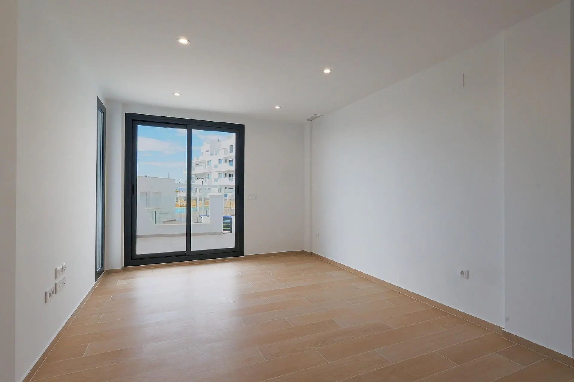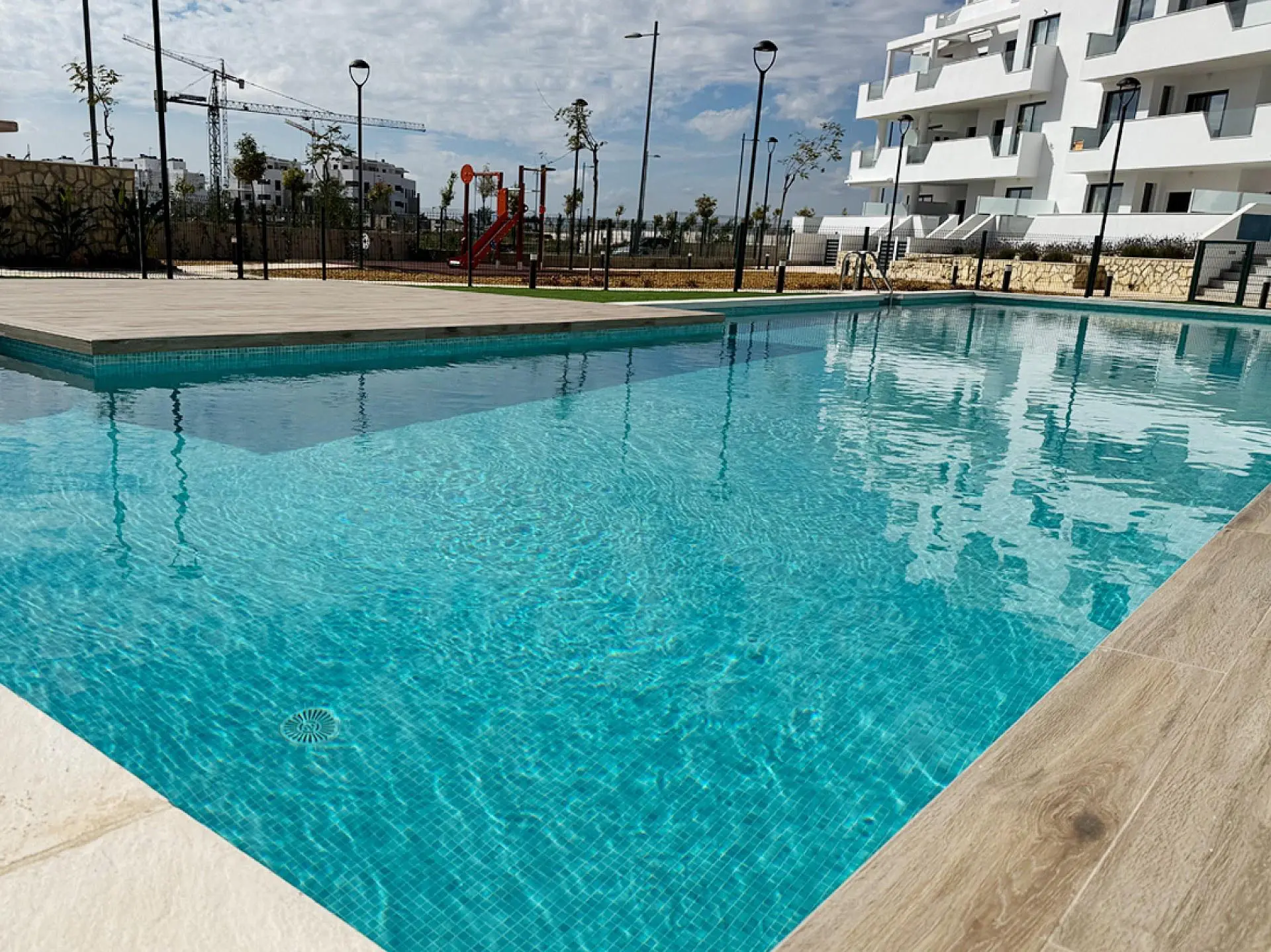 We present this exceptional ground-floor apartment and a beautiful terrace. The open-plan kitchen, with integrated appliances, has a modern look with matte white fronts. A versatile island also serves as a breakfast bar for cozy moments. In this kitchen, you`ll find a fridge-freezer, dishwasher, microwave, oven, induction hob, and extractor hood, all for your comfort. Both luxurious bathrooms are equipped with a toilet, elegant vanity unit, mirror, electric towel warmer, and a spacious walk-in rain shower. The master bedroom is an oasis of tranquility with a luxurious en-suite bathroom. An elegant ceramic tile floor with a warm wood look runs through the entire apartment and inspires coziness. From your spacious terrace, you have a beautiful view of the communal garden and swimming pools, as the house is situated on a higher level than the communal garden. Your private terrace offers direct access to the garden, part of which is covered. Your house faces southwest, so you`ll have sun most of the day, right up until sunset. The apartment is equipped with LED lighting both inside and out. Air conditioning and heating are installed throughout the apartment, a high-quality Toshiba brand. The windows are fitted with electric shutters. You can park your car in your private parking space in the apartment complex`s underground garage, where your storage unit is also located. The garage is accessible by elevator, and your parking space is spacious. In this beautiful residence, where your dream home is located, you have the opportunity to enjoy two magnificent swimming pools, one of which is sustainably heated by solar panels. There is also an inviting lawn and a children`s playground, perfect for unforgettable moments.