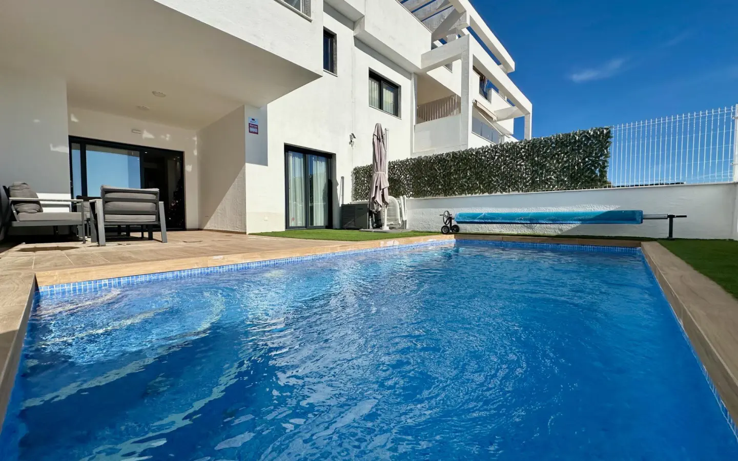 Se alquila el apartamento nuevo con piscina privada y climatizada en un complejo residencial en Finestrat cerca de CC La Marina. Está libre a partir del 08 de marzo de 2026 para larga distancia. Descubre este impresionante apartamento ubicado en el exclusivo área de Seascape Resort, Finestrat. Con una superficie construida de 120 m2 y útil de 73 m2, esta propiedad seminueva es perfecta para aquellos que buscan un hogar moderno con todas las comodidades. El inmueble cuenta con dos amplias habitaciones dobles y dos elegantes baños. Disfruta del aire libre desde su maravillosa terraza de 35 m2 con piscina privada y climatizada, mientras contemplas la tranquilidad que ofrece la zona. La propiedad también incluye parking privado y acceso a piscina comunitaria, ideal para disfrutar bajo el sol mediterráneo. Situado a tan solo 3000 metros del mar, estarás cerca tanto de playas como de centros comerciales y colegios locales; todo lo necesario al alcance sin sacrificar privacidad ni confort.