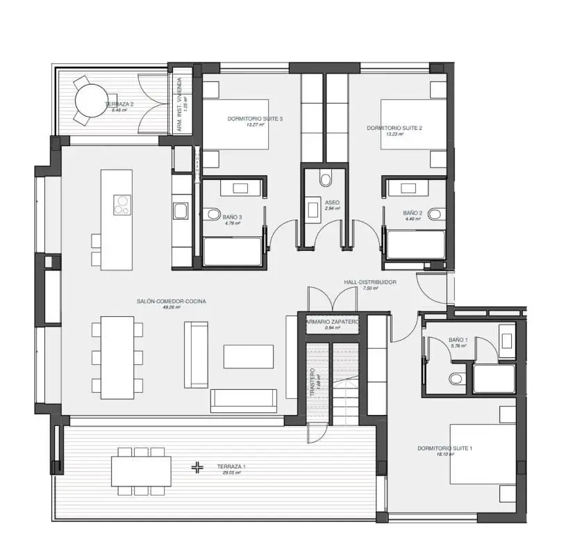 All bedrooms and the main living areas have direct access to a terrace facing south, which allows sunlight to enter throughout the day. The kitchens, dining areas, and living rooms are designed with an open plan and receive natural light through large windows. These windows open onto terraces that provide views of the community area and the surrounding landscape. Each apartment also includes a designated parking space and a private storage room located in the basement.