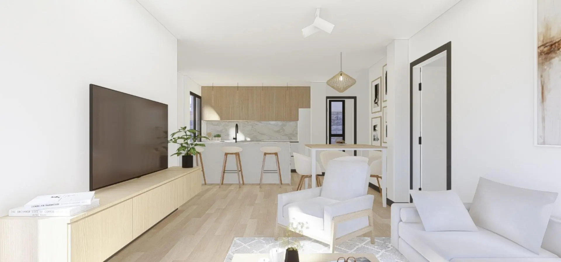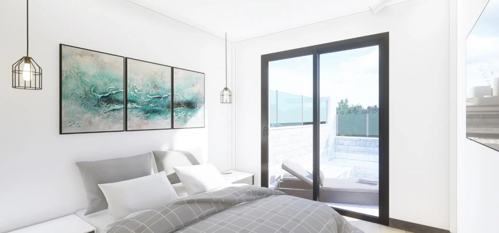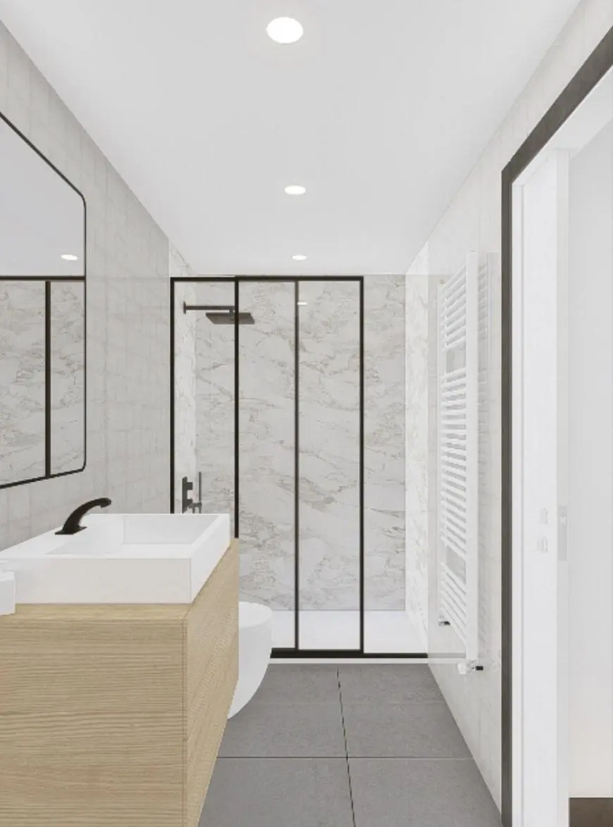 Inside the homes, the flooring consists of wooden laminate, while the terraces and common areas are finished with non-slip porcelain stoneware. The walls and ceilings are coated with smooth plastic paint, incorporating false ceilings made of plasterboard. The doors and cupboards are made of white-lacquered DM, featuring decorative molding and chrome handles. The walk-in closet is fully furnished.