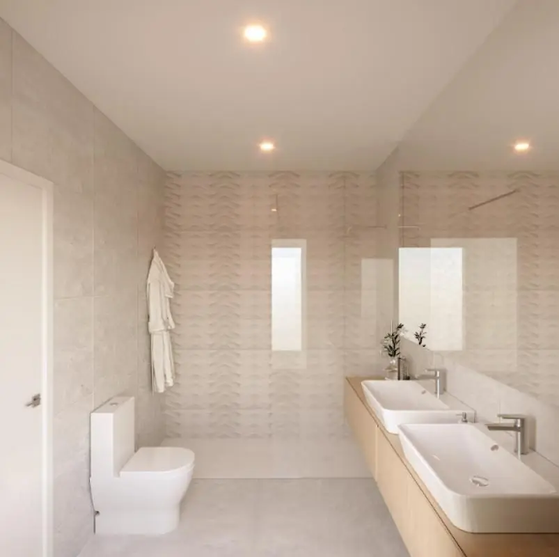 The interior design is characterized by a contemporary aesthetic. Flooring consists of large-format porcelain stoneware. The walls are finished with smooth plastic paint, and the carpentry is white lacquered.