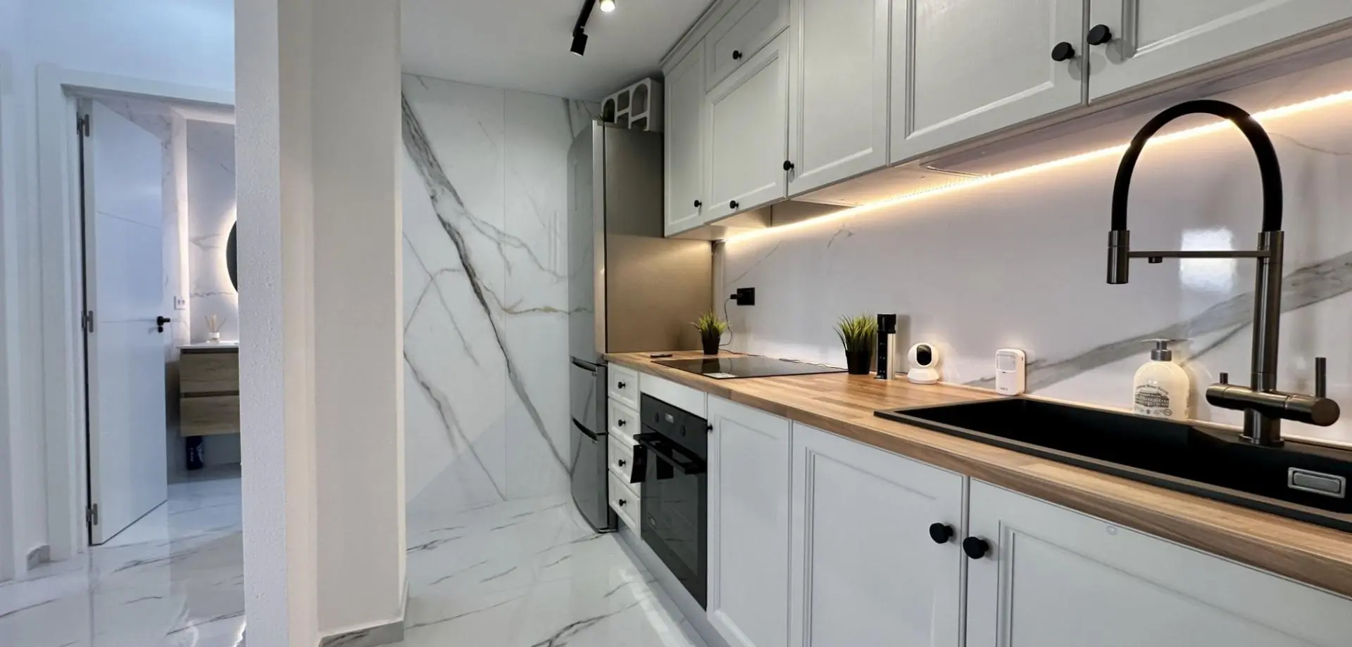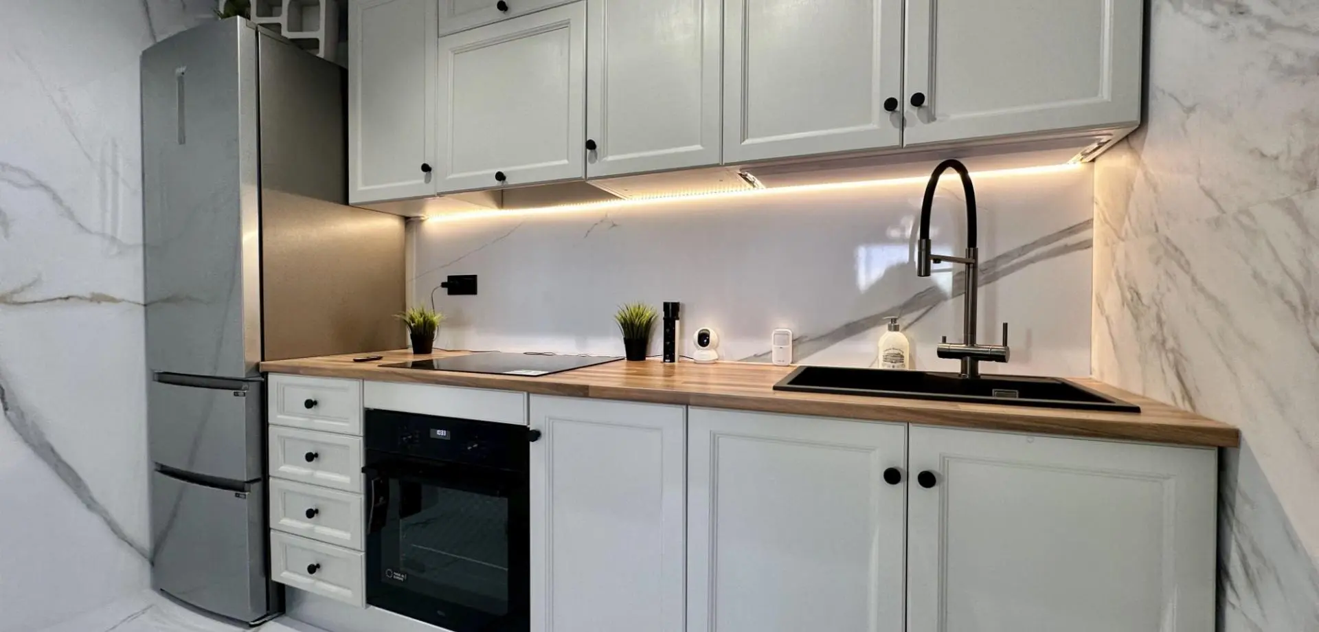Inside, the home consists of 1 bedroom, a contemporary bathroom with walk-in shower, and a cozy living space that flows to a 6.5 m2 balcony. High–quality finishes include LG and Samsung appliances, inverter air conditioning, 55” AI smart TV, washer–dryer, underfloor heating, smoke detectors, and Wi-Fi video surveillance.
