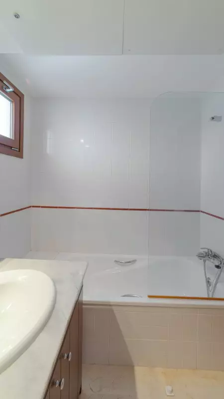 The apartment comes equipped with central air conditioning for both heating and cooling. The bathroom features underfloor heating, adding to the property’s utility. Additionally, the apartment is sold with a designated parking space in the underground garage, ensuring convenience for residents and guests. The gated community enhances security, with 24-hour surveillance present.