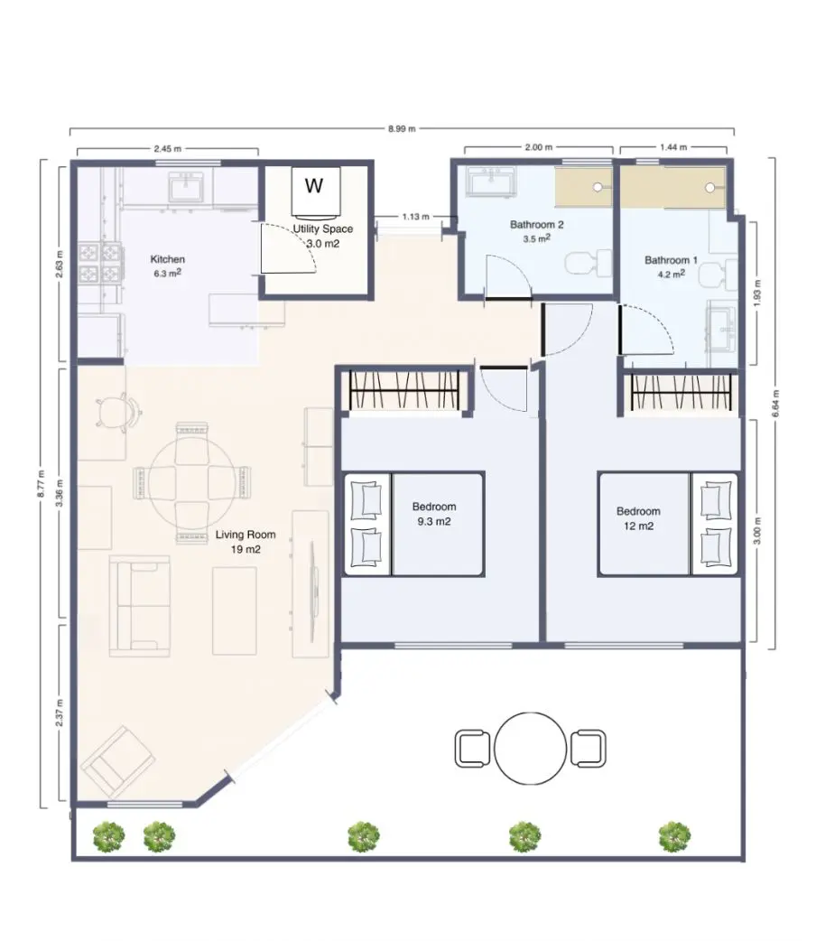 Located in the Villa Amalia residential complex, between La Veleta and Mar Azul, this ground floor apartment combines modern design with proximity to the sea. The property offers 2 bedrooms and 2 bathrooms, one of them en-suite, with a built area of 70 m2, a bright 20 m2 living room and a 20 m2 garden terrace facing southwest, ideal for enjoying the sun for most of the day. Built in 2017, the apartment includes an open kitchen fully equipped with appliances (oven, dishwasher, extractor hood, fridge, washing machine and dryer). Fully equipped: central air conditioning, underfloor heating in the bathroom, electric shutters, double-glazed windows and reinforced door. Furnished and ready to move in. The residential complex offers great facilities: 3 communal swimming pools, one of them heated for year-round use, gym, lift and fiber optic internet. A private parking space is also included. Its location is ideal, just a few minutes’ walk from the sea, close to all amenities and with excellent connections to the center of Torrevieja and the beaches of the Costa Blanca.