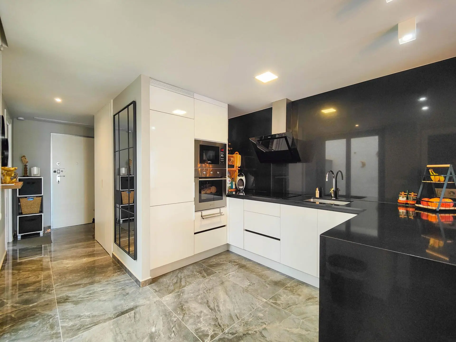 Stunning ground floor corner apartment for sale in a Res. Amanecer / Sunrise VI – Orihuela Costa. Discover this stylish and modern apartment located on the ground floor of a prestigious residential complex in Los Altos, La Florida. The property enjoys a south west facing corner terrace with direct views over the beautifully landscaped communal gardens and the swimming pool. This bright and spacious apartment features 2 bedrooms and 2 bathrooms, a contemporary open-plan living area, and a fully equipped modern kitchen with breakfast bar. The kitchen includes high-end appliances such as an oven, microwave, fridge-freezer, dishwasher, washing machine, and a ceramic hob with extractor. For added comfort, the bathrooms come with underfloor heating. Additional features include PVC windows with electric shutters (remote-controlled), central air conditioning, and the property is sold fully furnished—ready to move in. An underground parking space and a private storage room are included in the price. Set within a secure, gated community, the resort offers exceptional facilities including a large communal swimming pool, a children’s pool, palm-lined gardens with chill-out zones, a petanque court, and a complete fitness area with sauna and jacuzzi. Ideally located just steps from an Aldi supermarket, and a short drive to the renowned Zenia Boulevard Shopping Center and the beautiful beaches of Orihuela Costa.