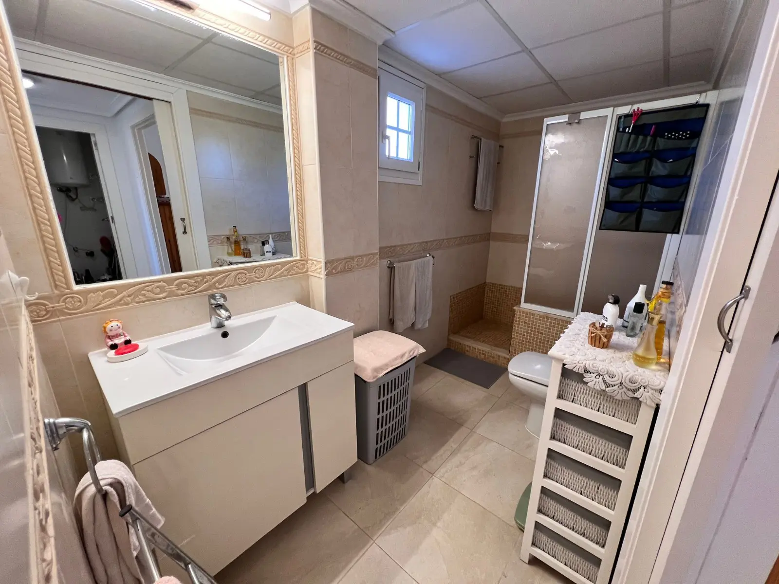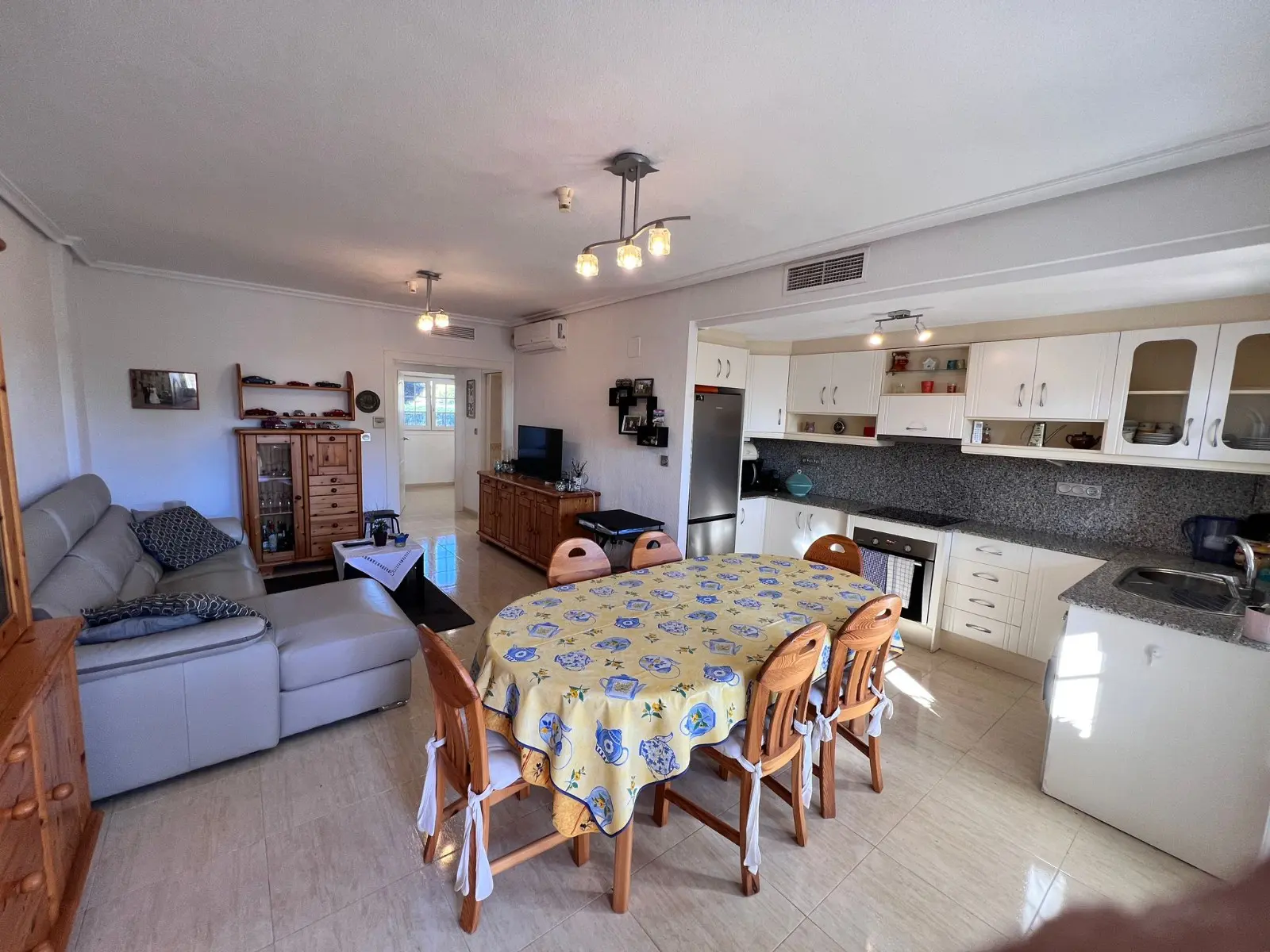 Inside, the apartment features a bright, open-plan living, dining, and kitchen area with French doors, electric shutters, and air conditioning. Two well-sized bedrooms, both with fitted wardrobes, are accessible from the hallway. The master bedroom has direct access to the rear terrace. There is also a spacious bathroom with a shower and a practical utility room.