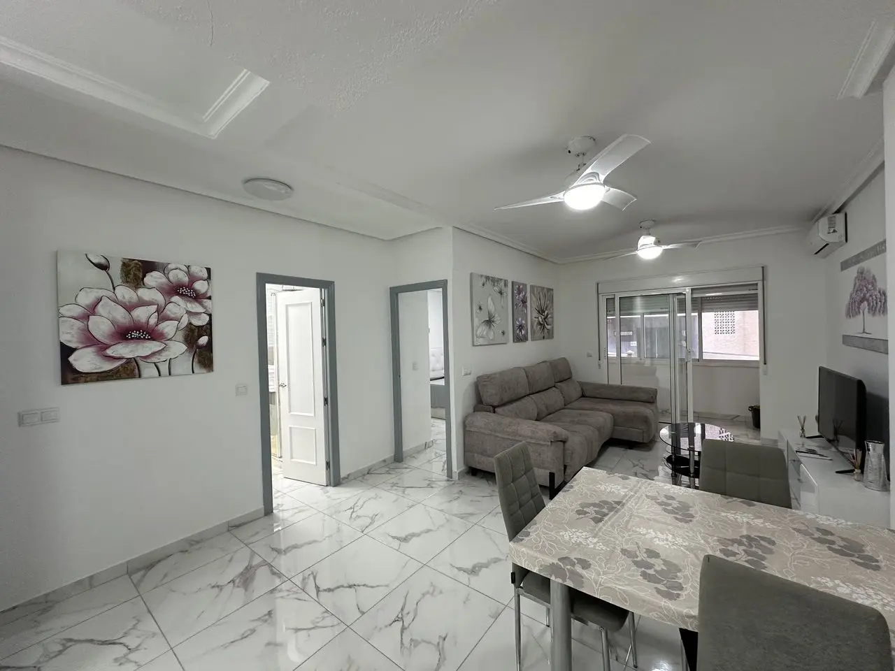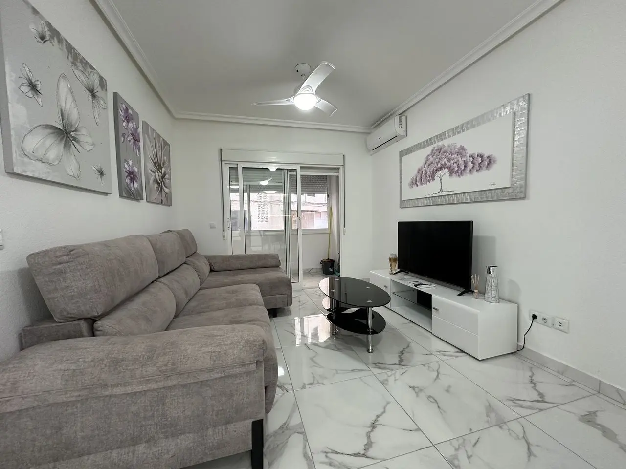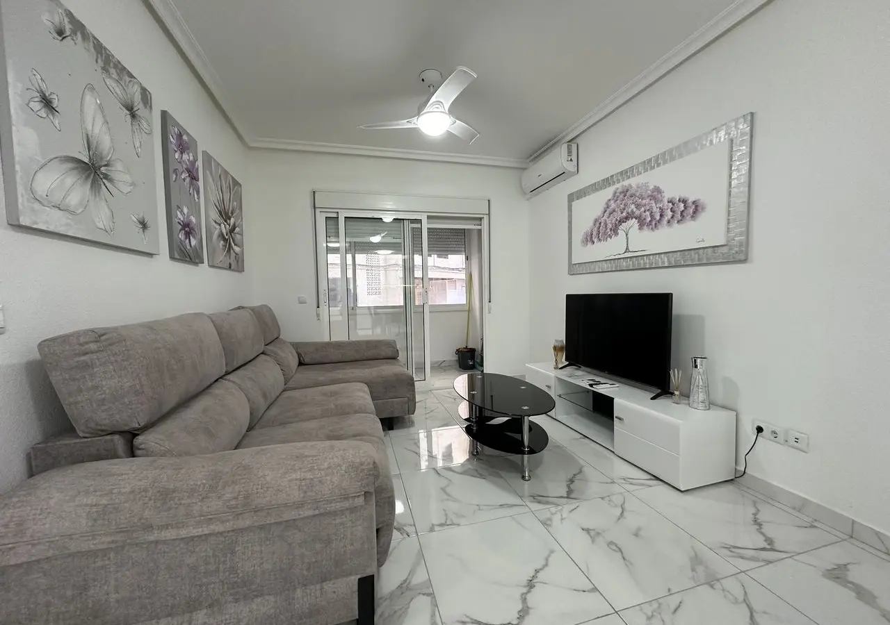 PRIME LOCATION 50m from Playa del Cura, Torrevieja beach is this elevated ground floor apartment. This fabulous 2 bedroom, 2 bathroom apartment has been reformed throughout with a brand new fully equipped kitchen along with 2 stylish bathrooms. The apartment has a huge living and dining room with access to a private glazed terrace with views down to the beach front. The property has two big bedrooms both with fitted wardrobes. The property has been tastefully reformed with modern floor tiling and is sold fully furnished and finished with air-conditioning. The property forms part of a very well maintained private complex where home owners have access to the communal showers and changing rooms to make it easy to wash-off the sand from the beach.