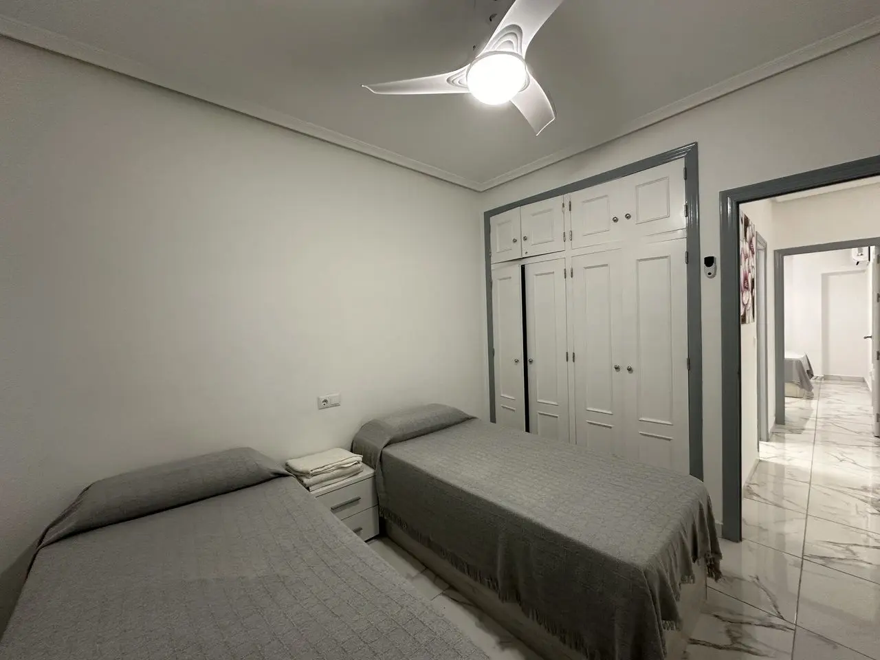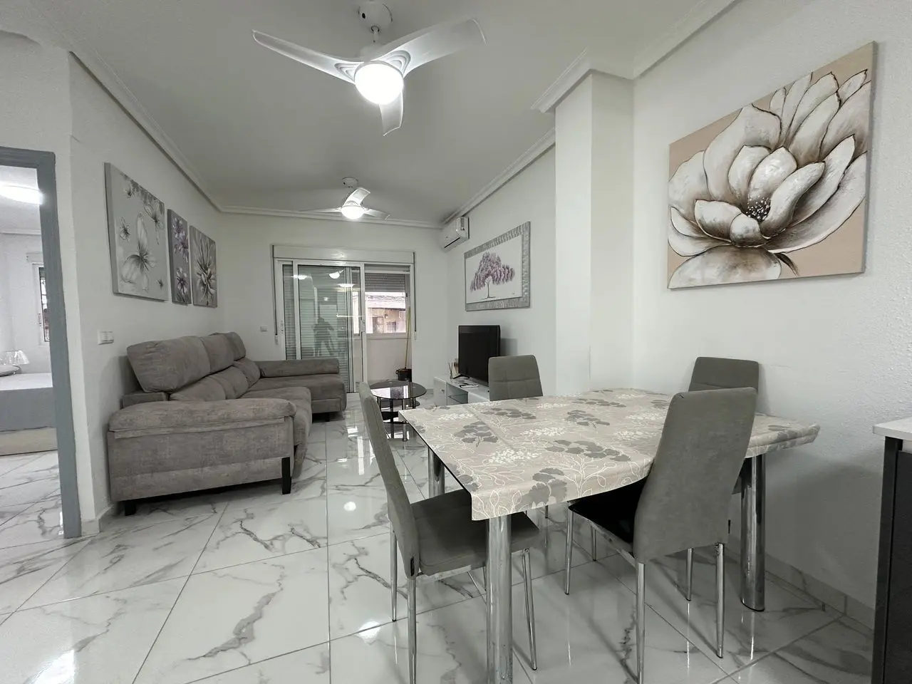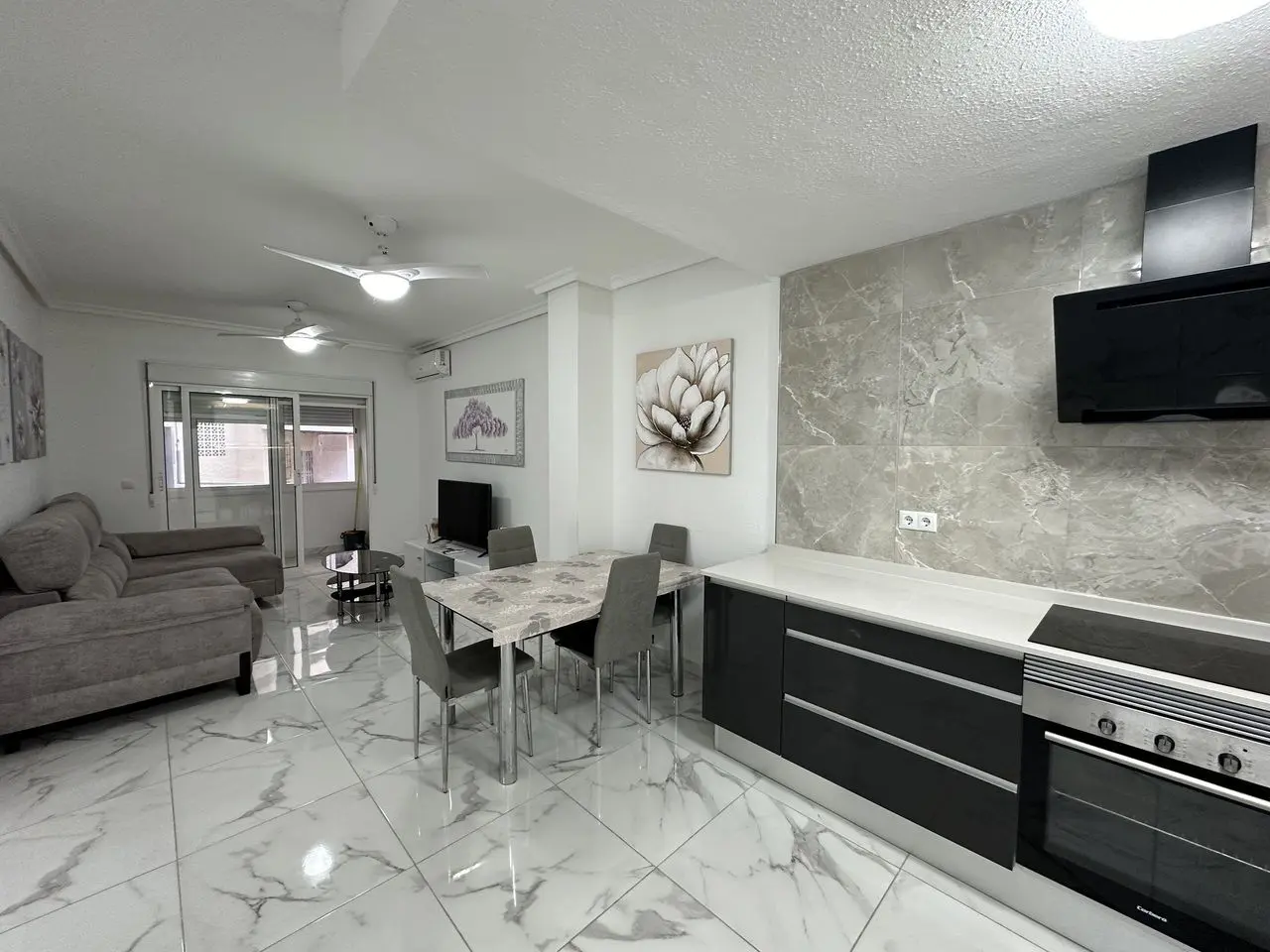 PRIME LOCATION 50m from Playa del Cura, Torrevieja beach is this elevated ground floor apartment. This fabulous 2 bedroom, 2 bathroom apartment has been reformed throughout with a brand new fully equipped kitchen along with 2 stylish bathrooms. The apartment has a huge living and dining room with access to a private glazed terrace with views down to the beach front. The property has two big bedrooms both with fitted wardrobes. The property has been tastefully reformed with modern floor tiling and is sold fully furnished and finished with air-conditioning. The property forms part of a very well maintained private complex where home owners have access to the communal showers and changing rooms to make it easy to wash-off the sand from the beach.
