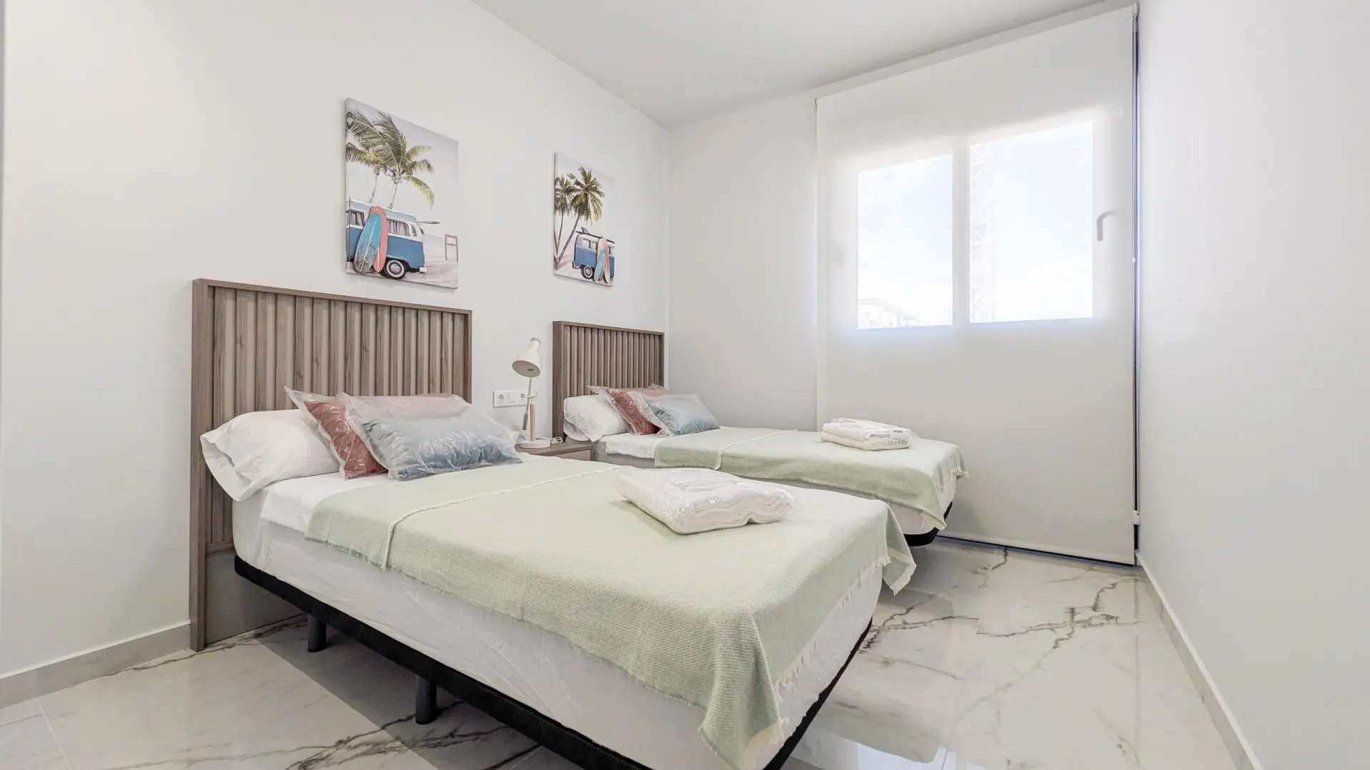 Modern apartments are for sale on the sunny coast of Orihuela Costa. The house has an area of 95 m2, which makes it spacious and bright, suitable for any lifestyle. The apartments have 2 cozy bedrooms and 2 equipped bathrooms. The open plan includes a kitchen combined with a living room. You can exit to a charming balcony from the kitchen.Also, the apartment has an impressive terrace of 20 m2. This open space is perfect for outdoor dinners or simply relaxing in the sun, serving as a natural extension of the living room.The apartment is equipped with central air conditioning. There is an elevator in the building.Residents have access to a communal pool – an ideal place to cool off and socialize with neighbors and friends. The complex also has a jacuzzi, gym, and sauna.The price includes a garage and a storage room.Perfect location: The apartment is located in Orihuela, a city known for its stunning beaches and vibrant coastal lifestyle, just a few steps away from everything you may need, from local restaurants to shops. Thanks to the south-facing orientation of the house, natural light fills every corner, creating a warm and cozy atmosphere.Online reservation is possible, as well as purchasing on credit from a bank at 4-6% per year.