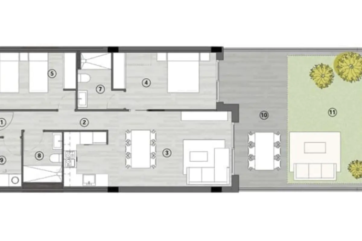 With three bedrooms and two bathrooms, the apartments are designed to maximize views of the sea, the beach, and the communal areas. Within these communal areas, you will find a communal swimming pool and meticulously maintained gardens. The construction utilizes high-quality materials, and these homes provide exceptional amenities. These include underground private parking, storage rooms, landscaped areas, a bio-healthy circuit, bicycle parking, and a playground.