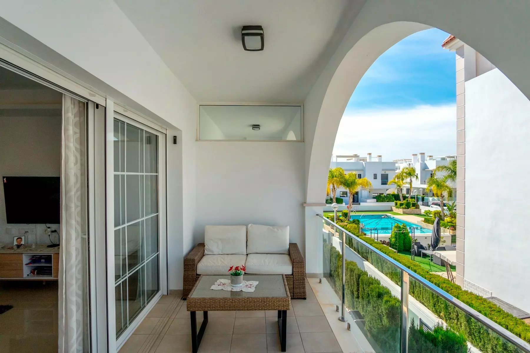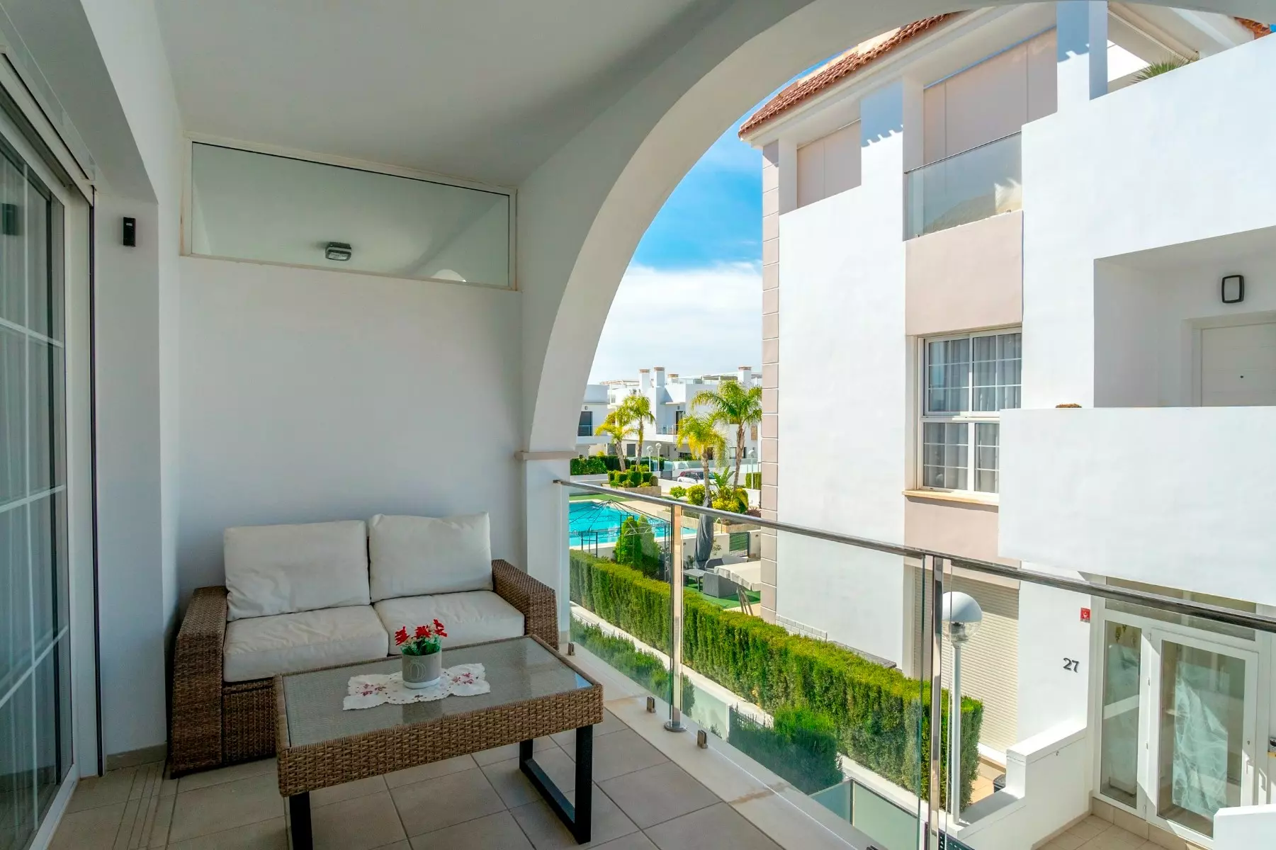 Step outside to the terrace for views of the pool and the surrounding area. The outdoor space is not just an extension of the living area but a venue for leisurely meals or perhaps relaxing with a good book. As the sun sets, you can enjoy the array of colors that fill the sky, providing a picturesque backdrop.