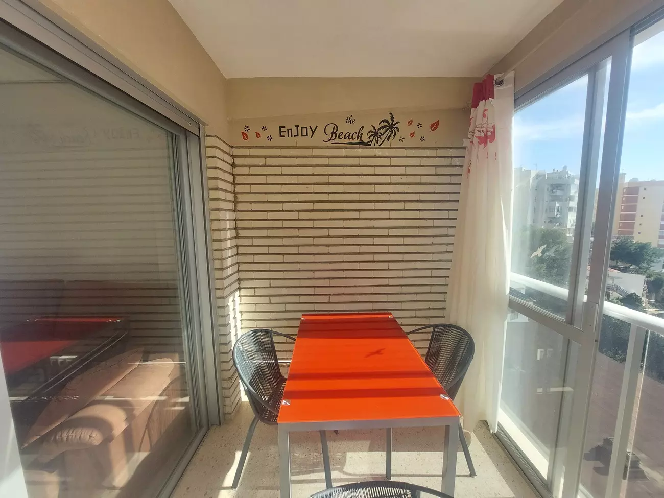 Situated on the 4th floor, the apartment includes a double bedroom with built-in wardrobes, a family bathroom, an open-plan American kitchen, and a living/dining area that opens onto a year-round terrace showcasing stunning sea views. The corner positioning also features an additional side terrace, which can be utilized for extra storage, a laundry area, or to enhance the living space.