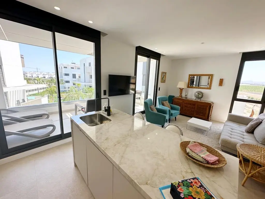 KEYREADY…We are excited to offer this resale two bedroom two bathroom second floor apartment located on the Santa Rosalia Lake and Life Resort which boasts a large crystal lagoon, beach club, clubhouse, adventure golf, and sports facilities just 5 km to the beaches of Los Alcazares. No need to wait for your property to be built as this is a resale and comes furnished (excluding the sideboard and patio furniture) with vented AC. On entering the property the lounge kitchen diner is to your left and comes with an island and patio doors to the south facing terrace which has views over the orange groves. There are two double bedrooms with fitted wardrobes. One bedroom has an ensuite and there is a further bathroom which could easily be made into an ensuite by adding a door in the hallway. There is a cupboard in the hall which houses the boiler and the washing machine. This apartment comes with covered parking and a storeroom and there is a community pool which is heated for year-round use. The owner has all the permits in place for rental. Contact us to arrange to view this apartment, we would love to hear from you.