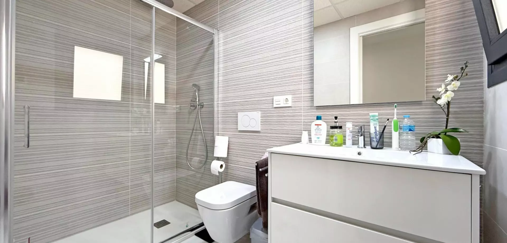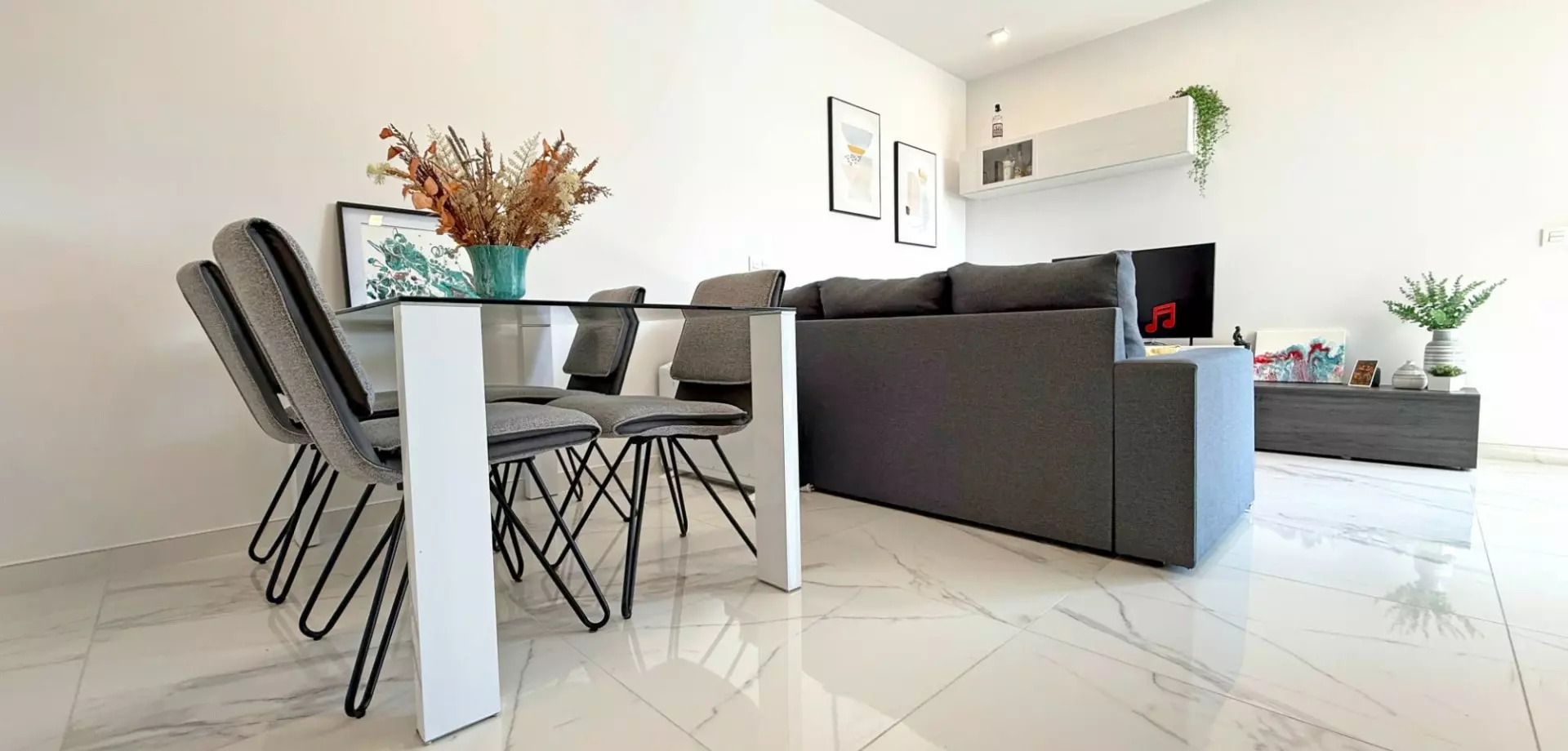 The open-plan living and dining area connects seamlessly with sliding doors to the large private balcony. These sliding doors come equipped with mosquito nets, providing increased comfort year-round. The balcony also has a glazed enclosure, allowing residents to enjoy outdoor views even during cooler evenings.