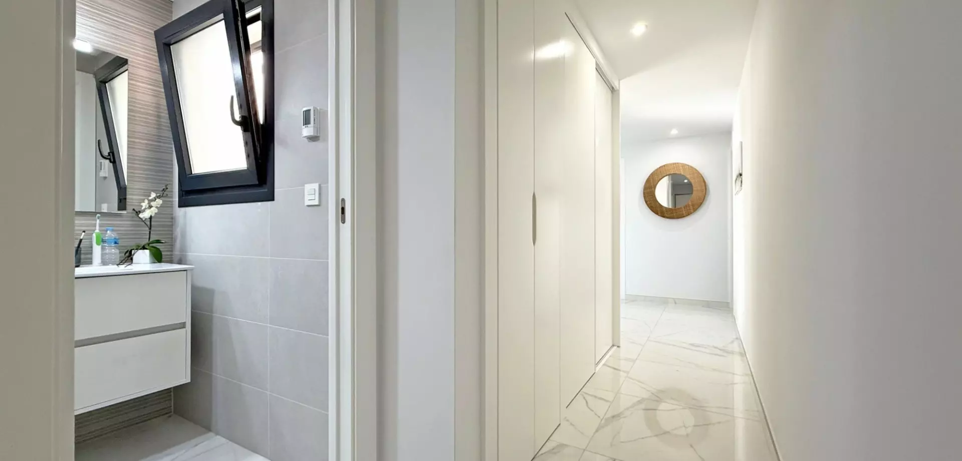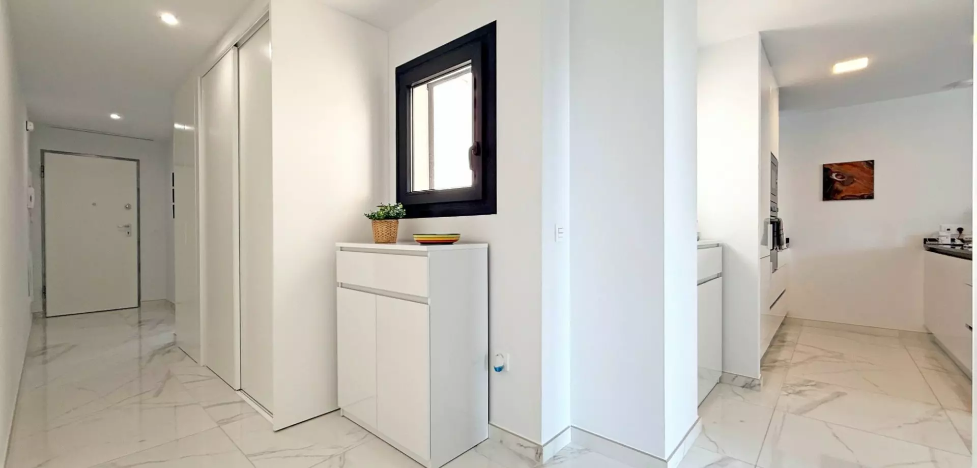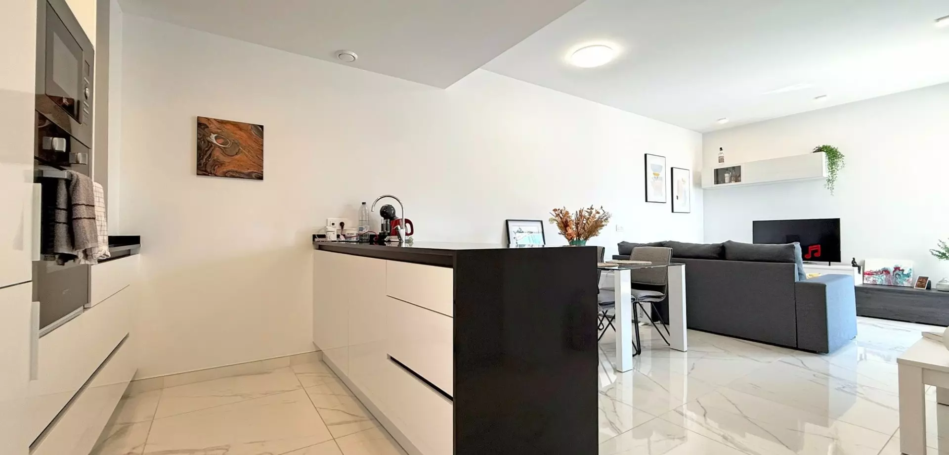 Built in 2021, this third-floor unit features 84 m² of efficiently organized living space. The apartment includes a sunlit 19 m² terrace that offers panoramic views of the communal pool and gardens, creating an open and airy environment.