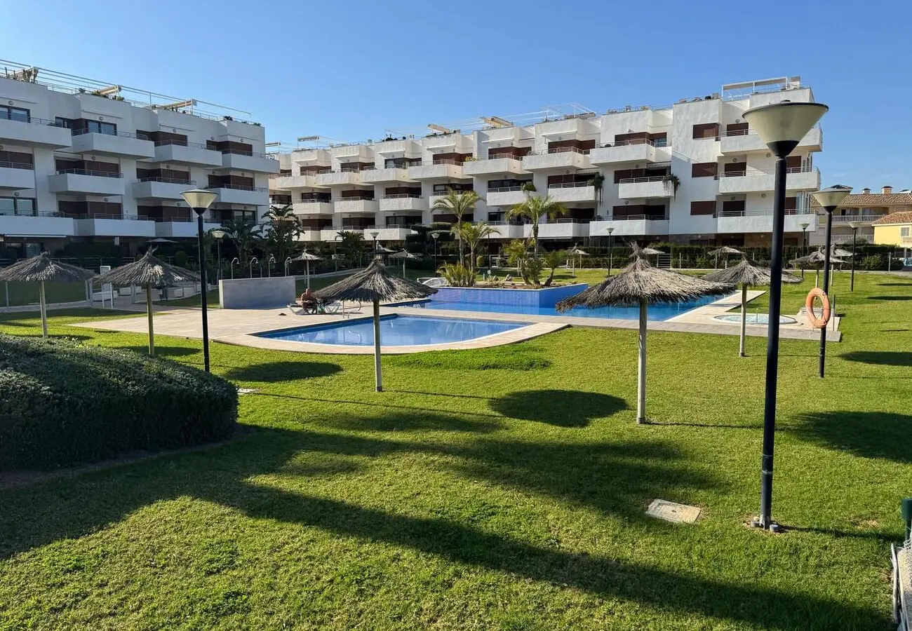 Beautifully maintained ground floor apartment with 2 bedrooms and 2 bathrooms in the Lomas de Cabo Roig area. This ready-to-move-in corner apartment is ideal for those looking for comfort, space and a wonderful Mediterranean lifestyle. Thanks to the corner location, you can enjoy extra light and more privacy. Fully south-facing, sun canopy and airco available and underground spacious parking space just below the apartment. Located in a beautifully landscaped and well-maintained residential complex with two communal swimming pools and beautiful gardens. The area is quiet, yet close to all amenities. It is centrally located in the heart of Playa Flamenca with only a short walk to two lovely beaches, a supermarket, bakery, pharmacy and plenty of restaurants. In addition, it is only a five-minute walk to the popular Saturday market and the famous Zenia Boulevard shopping centre.