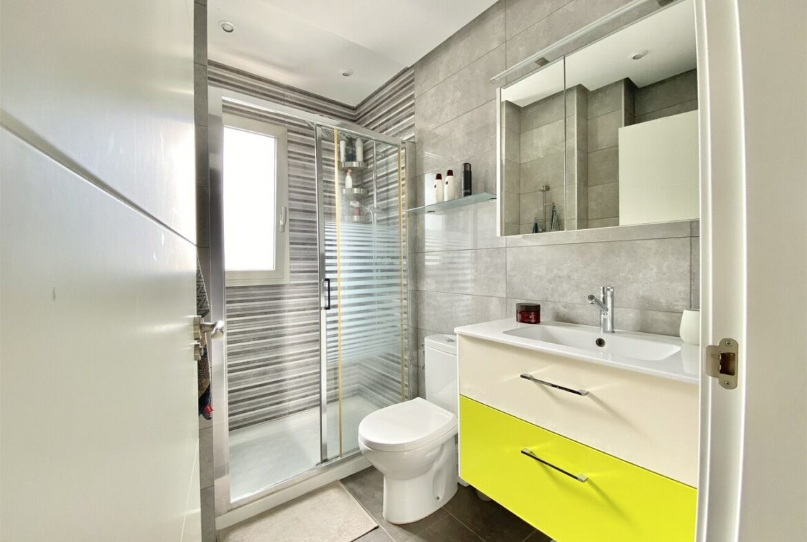 A large south-facing balcony is accessible from both the living room and one of the bedrooms. This balcony invites opportunities for outdoor relaxation. Additionally, a significant roof terrace features an outdoor shower and storage, making it functional for both storage and leisure.