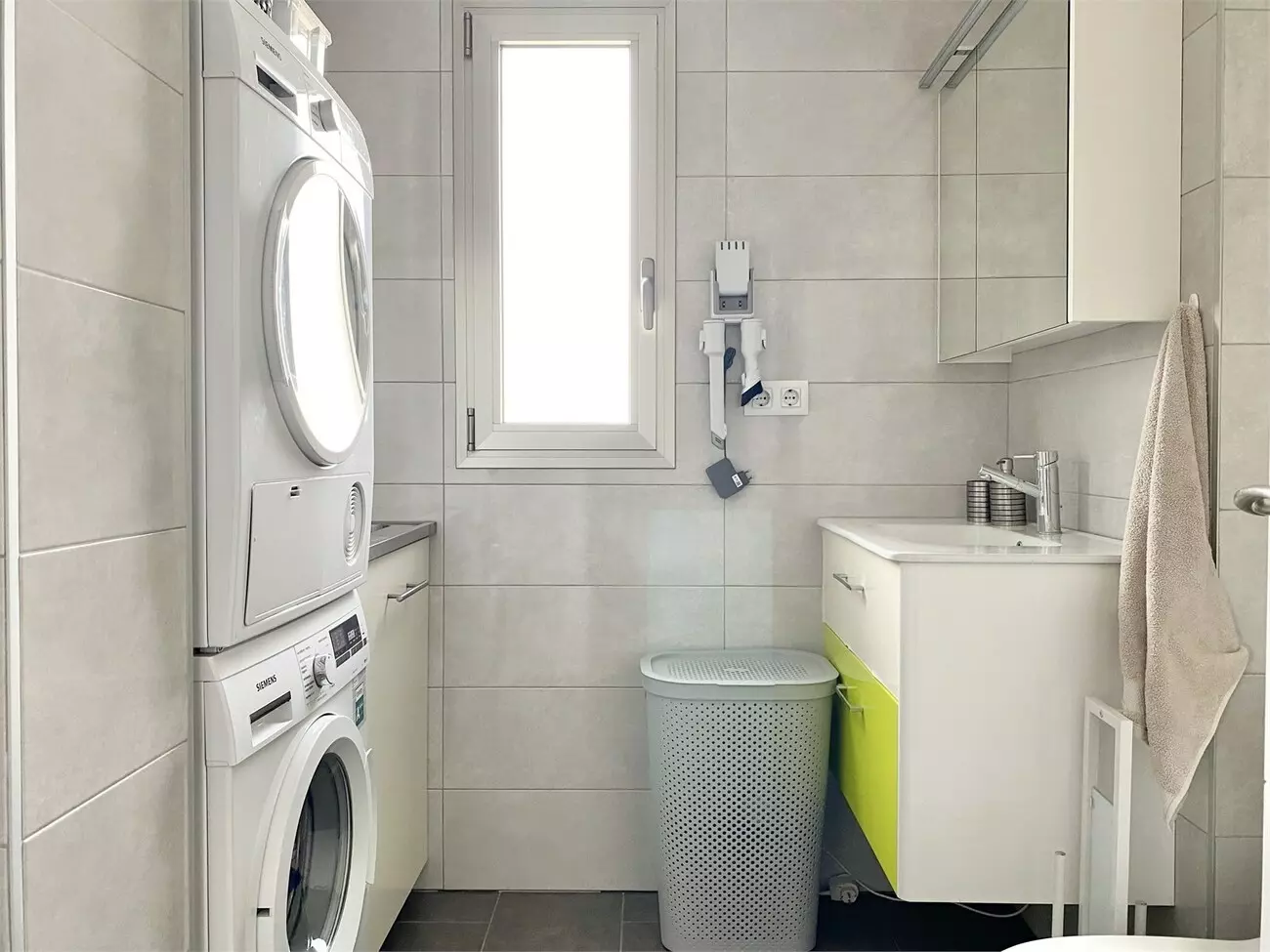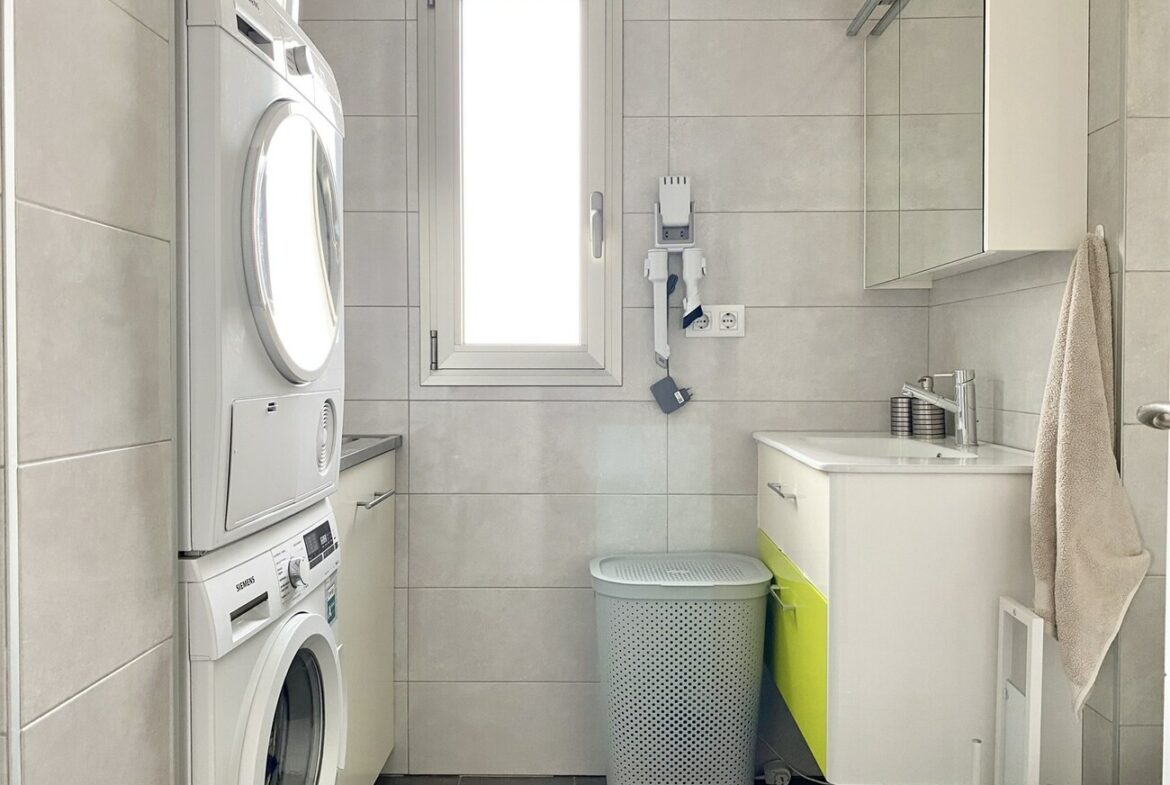 The large kitchen provides generous cupboard space, alongside designated table space for casual meals or morning coffee. Appliances are included, making this kitchen ready for immediate use. Several new beds in the apartment add to the practicality of the setup.