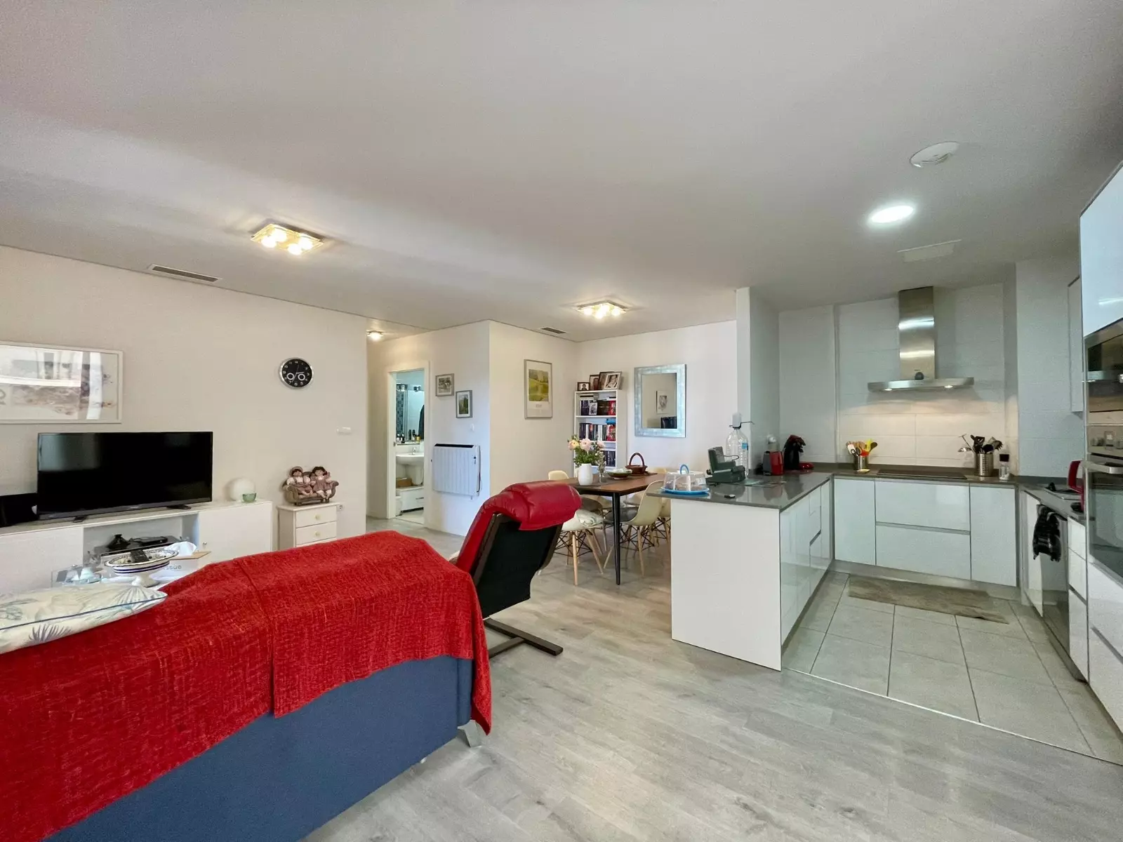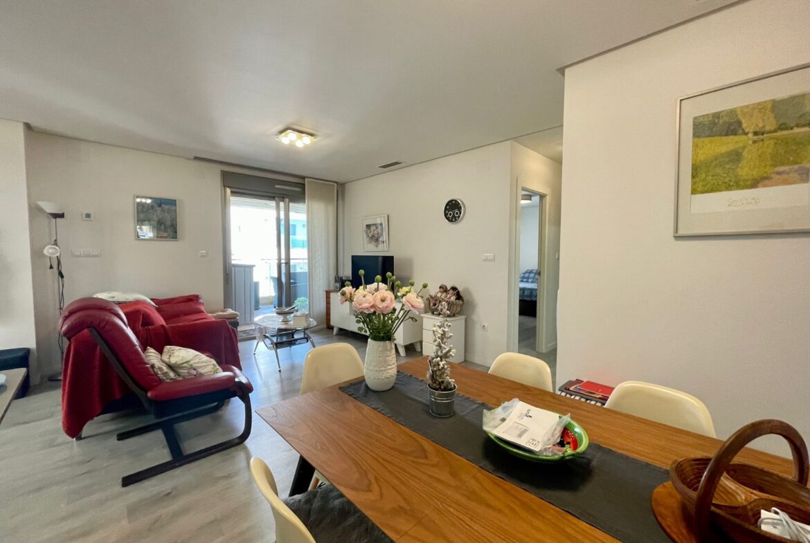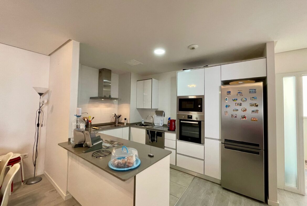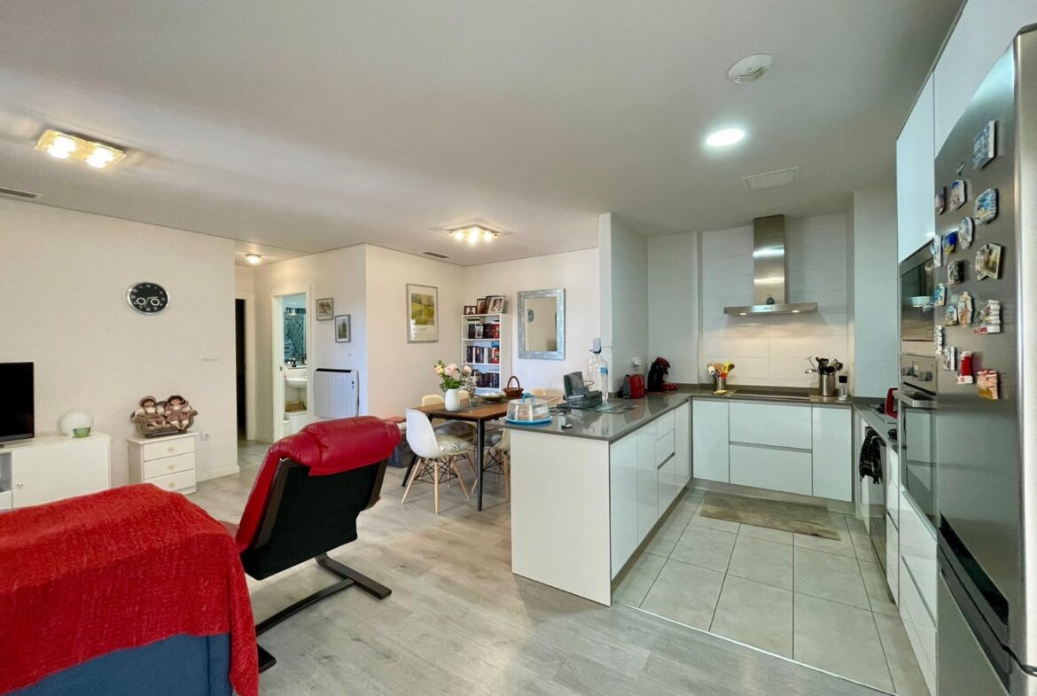 The apartment features two bedrooms and two bathrooms, one of which is ensuite. The living space is designed with an open layout that combines the bright living room with a fully equipped kitchen, creating a continuous flow. This design is practical for both relaxation and hosting guests.