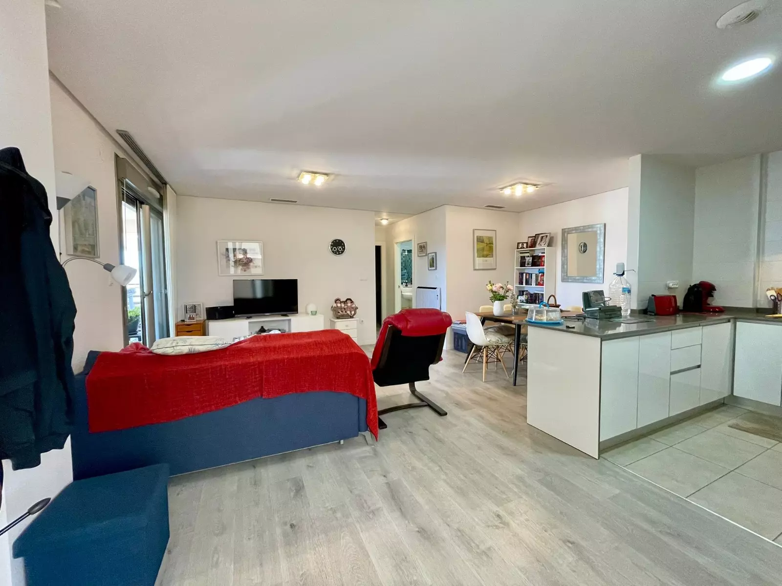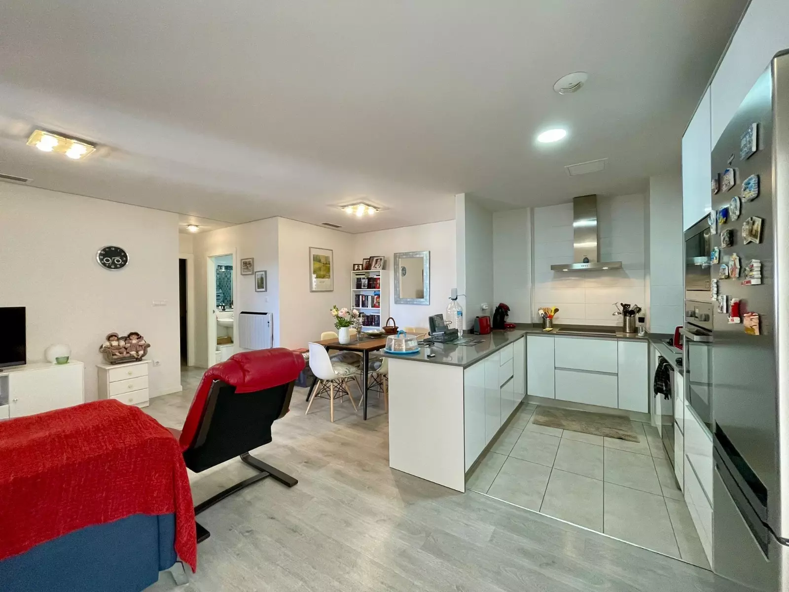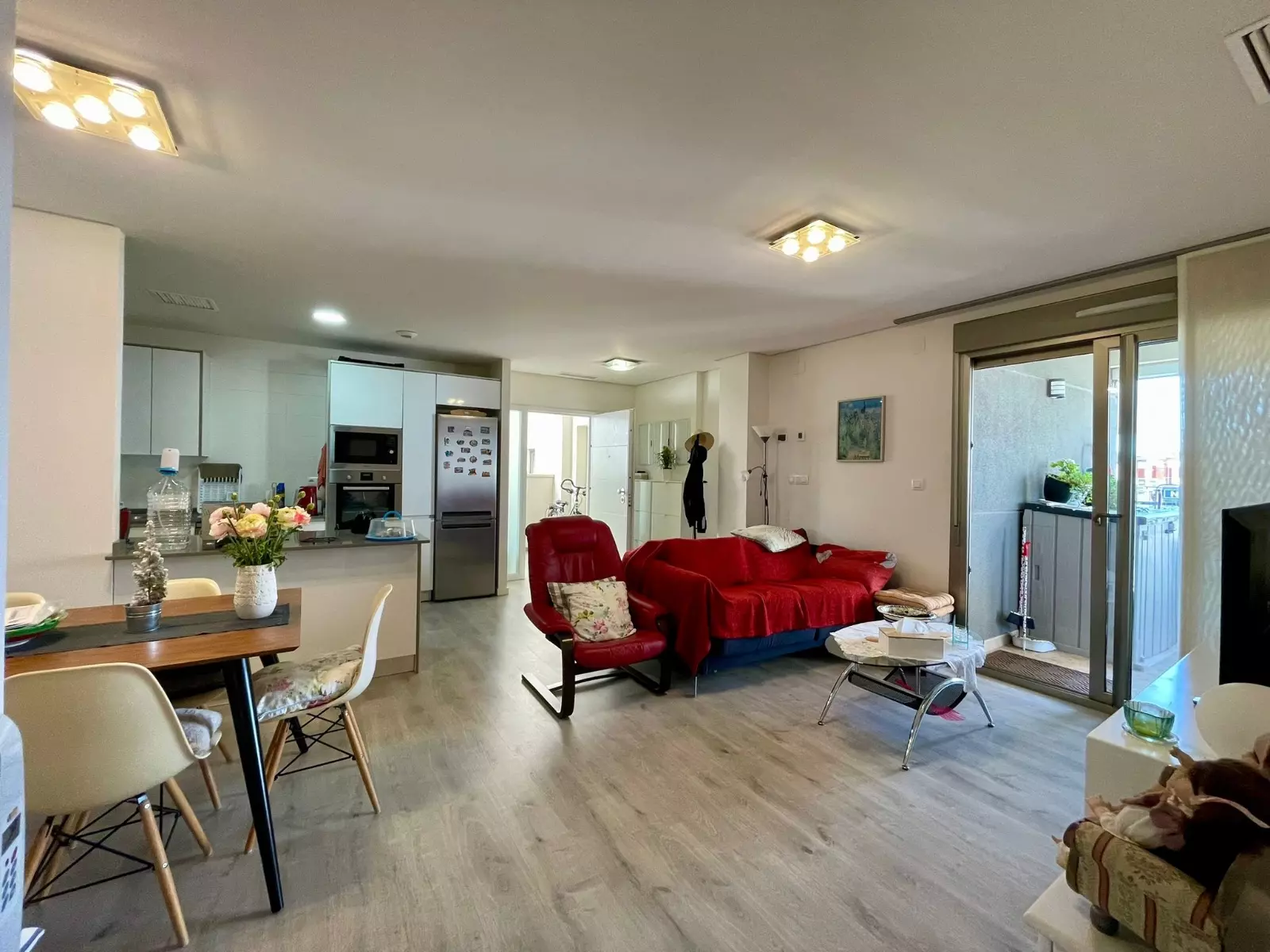 The apartment features two bedrooms and two bathrooms, one of which is ensuite. The living space is designed with an open layout that combines the bright living room with a fully equipped kitchen, creating a continuous flow. This design is practical for both relaxation and hosting guests.