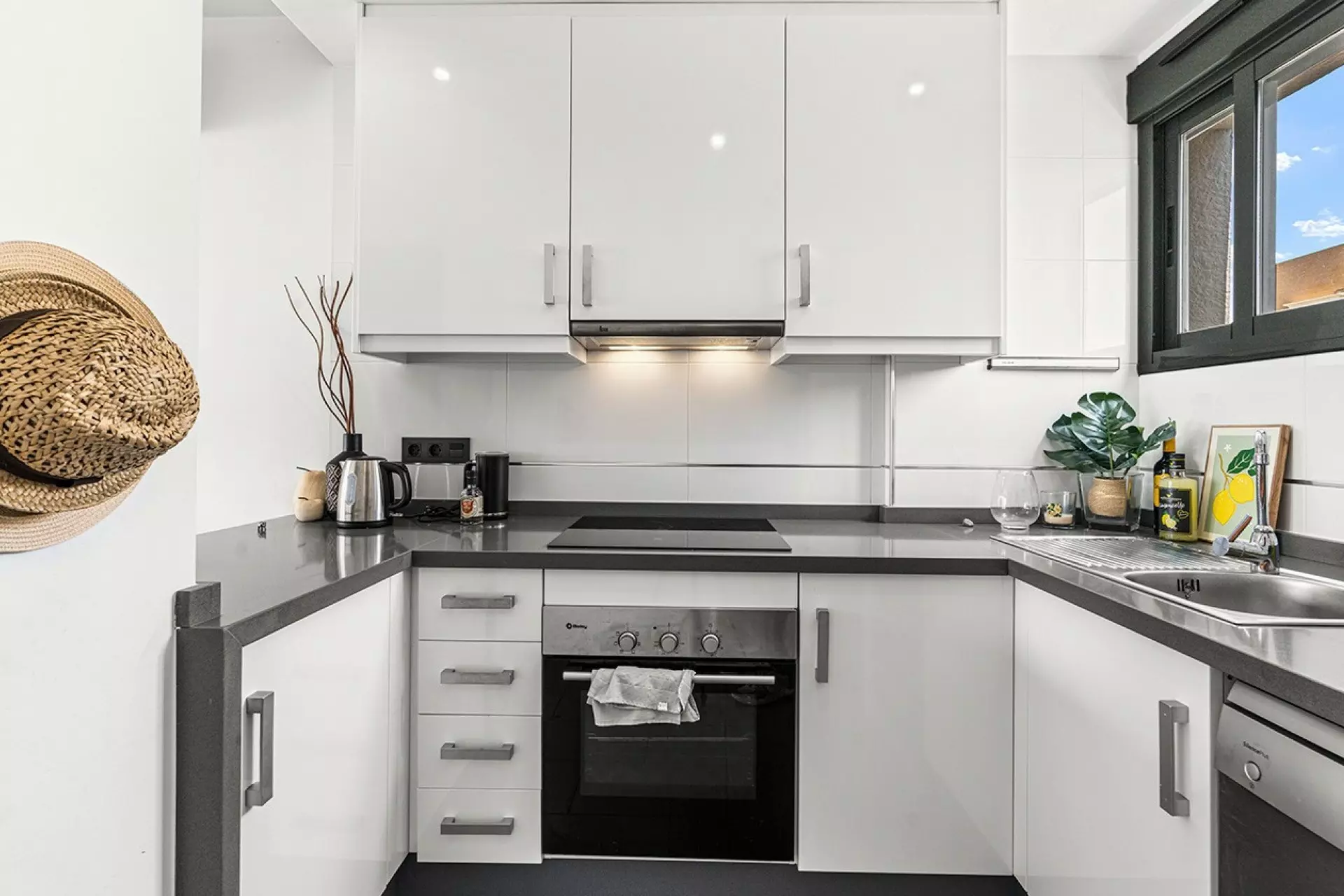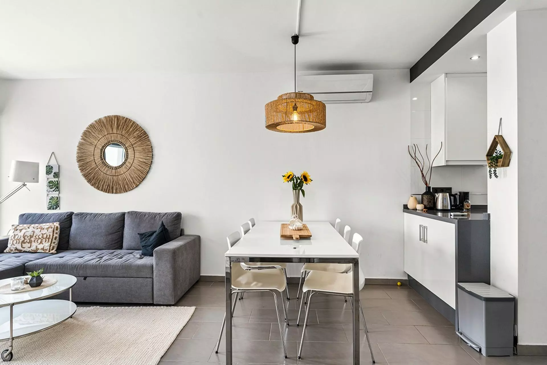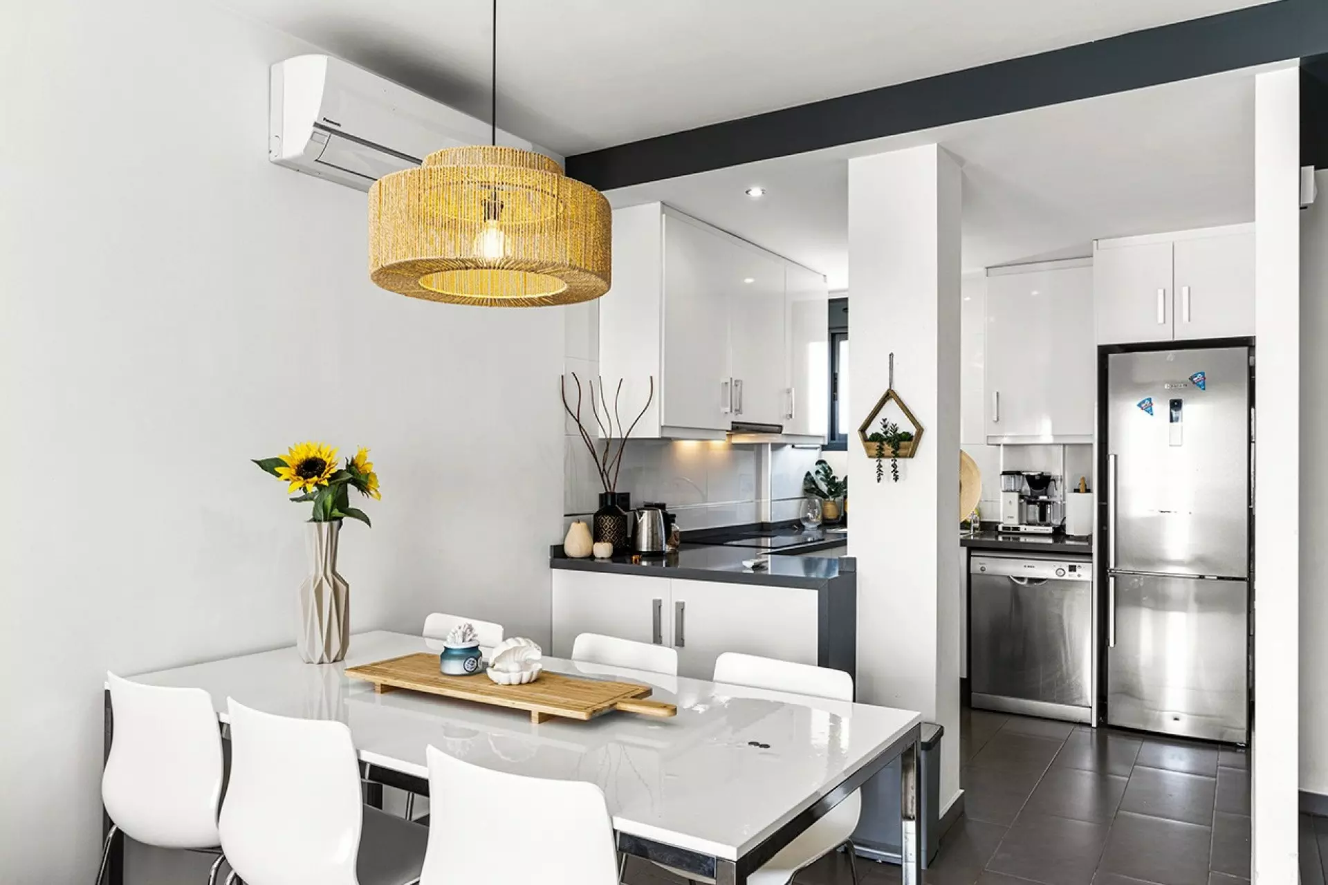 The open-plan kitchen connects smoothly with a bright living-dining area. This space leads out to a private terrace, which includes an awning suitable for outdoor moments.