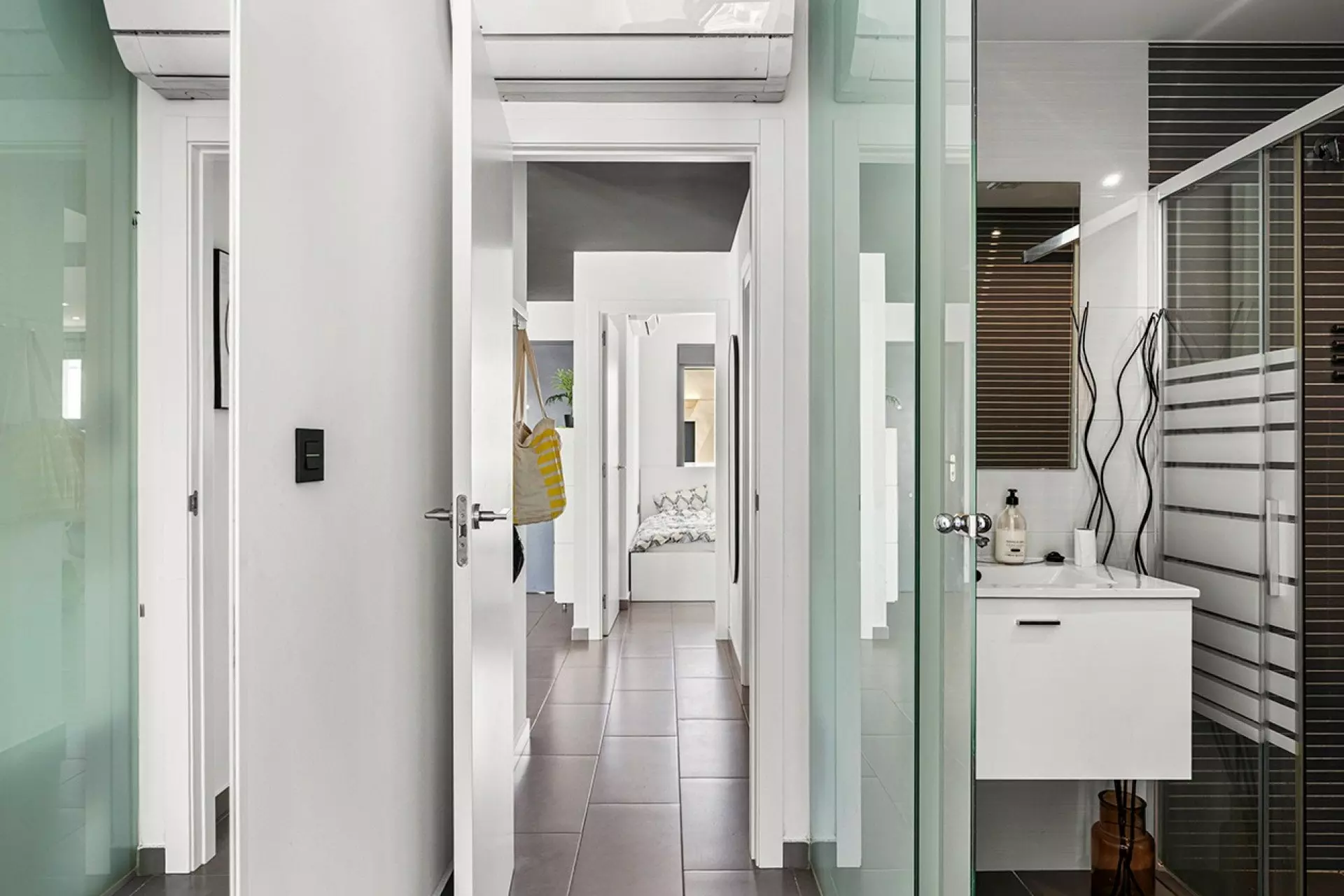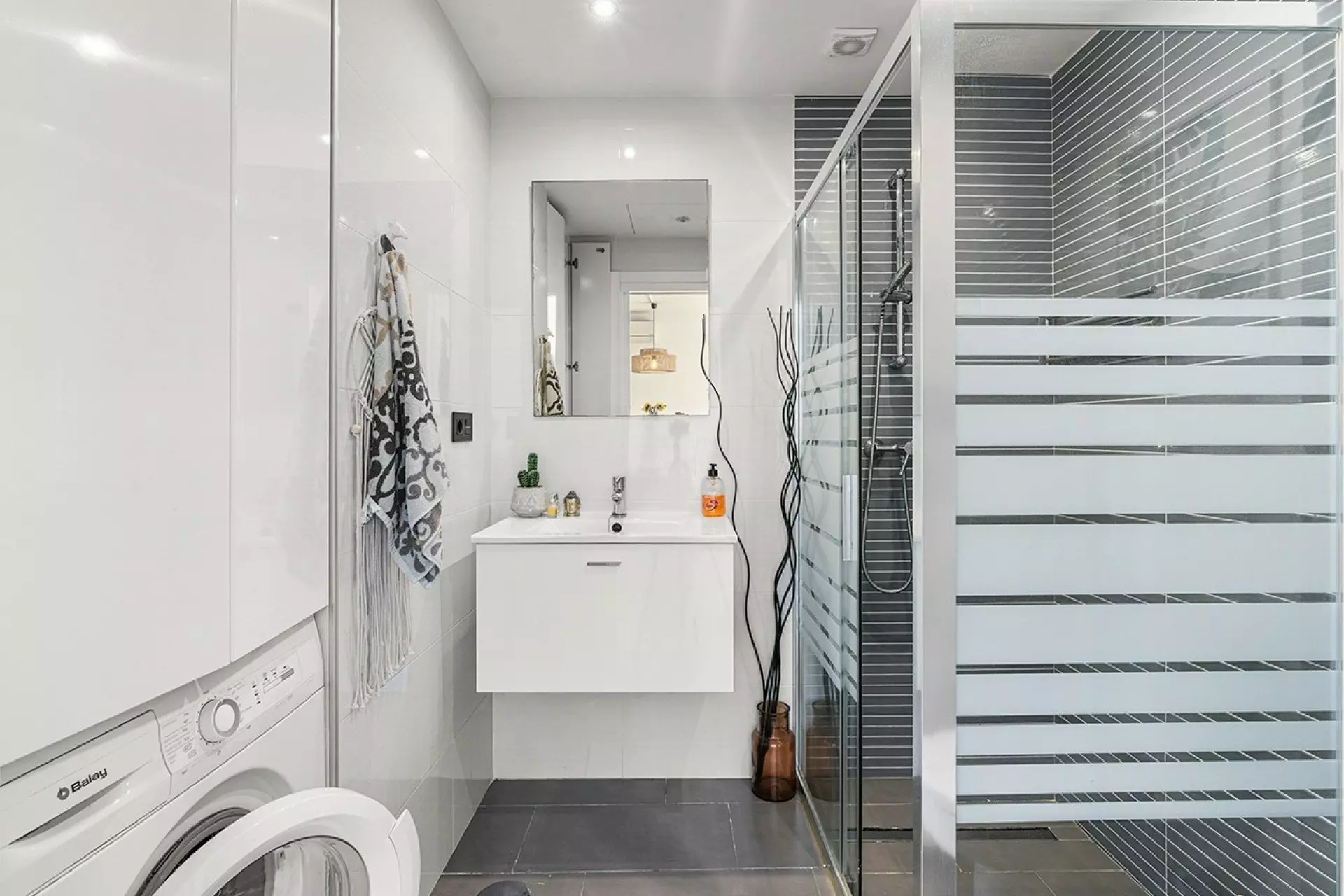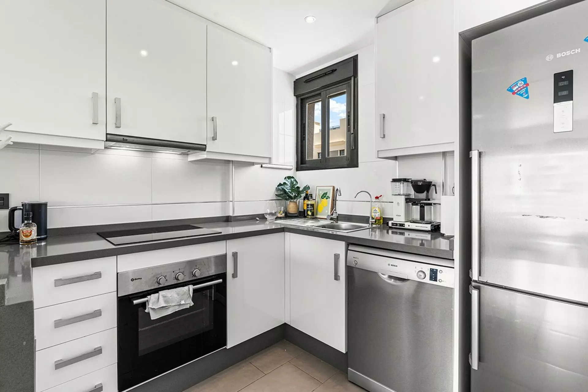 The open-plan kitchen connects smoothly with a bright living-dining area. This space leads out to a private terrace, which includes an awning suitable for outdoor moments.
