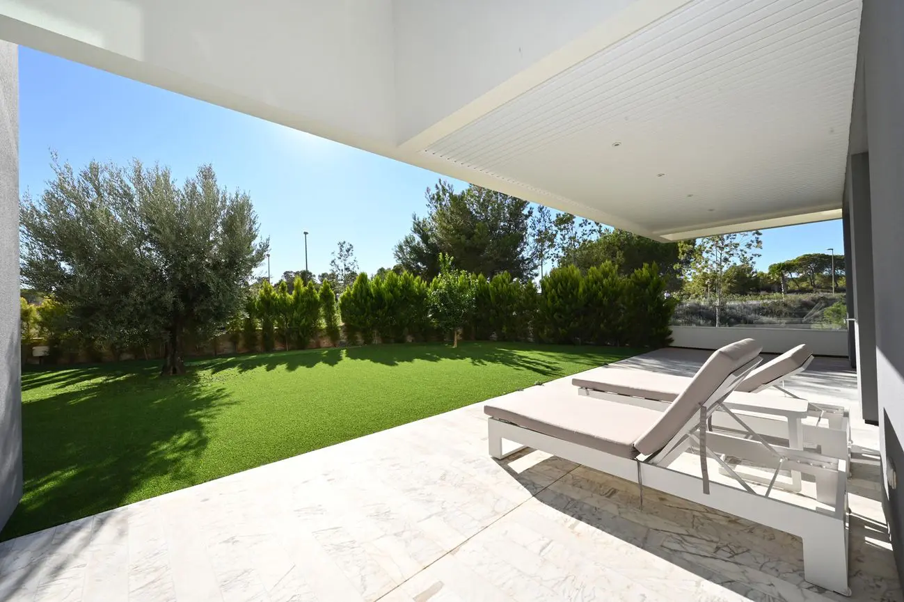 Enjoy a large terrace that offers a panoramic view of the golf course and the Mediterranean forest. This outdoor space provides a perfect spot to relax and take in the scenery.
