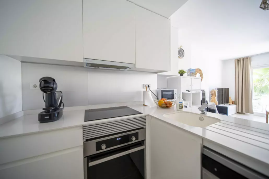 The living area is bright and includes an integrated kitchen equipped with essential appliances, allowing for easy meal prep. Adjacent to the living room is a dining area, which makes it another inviting spot for family meals or entertaining guests. Step out onto the sunny west-facing terrace, where views of the communal pool and landscaped garden can be enjoyed.