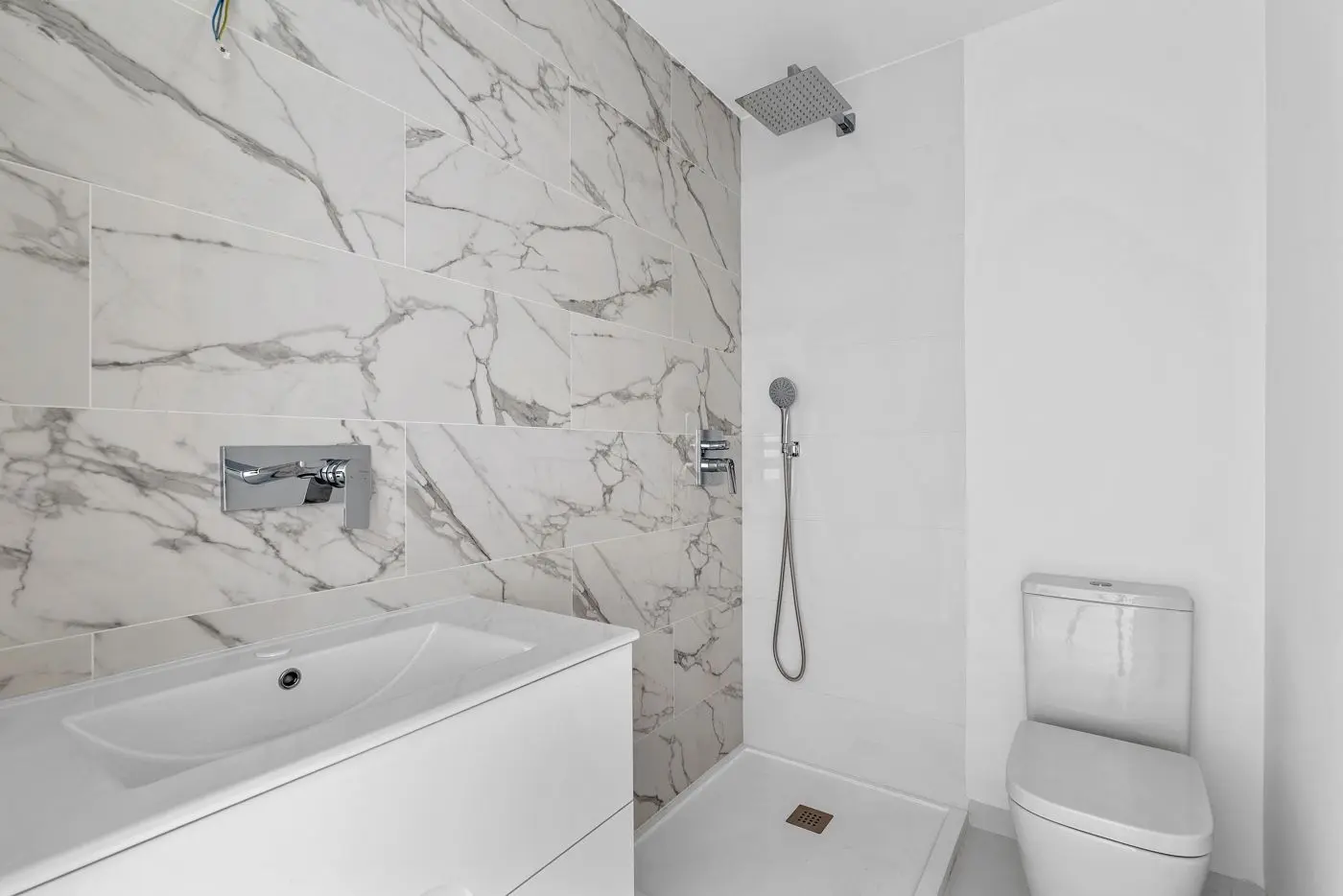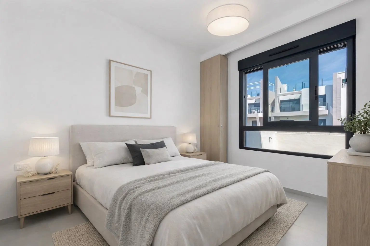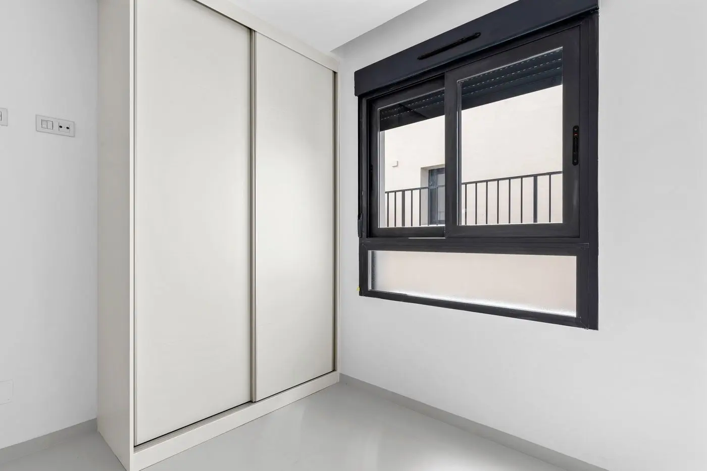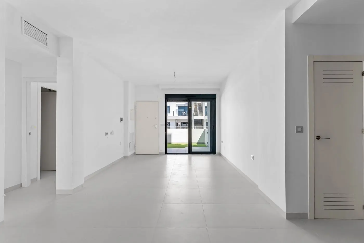 Come see this recently completed, practically brand-new ground-floor flat in the charming town of San Miguel de Salinas. This brand new residential complex offers a perfect blend of modern comforts and Mediterranean outdoor living. The flat features 2 spacious bedrooms and 2 stylish bathrooms, making it ideal for both permanent living and holidays. The open-plan living and dining room seamlessly connect to the outdoor areas, providing natural light and a sense of space. Enjoy the two private terraces, one at the front and one at the back, which are ideal for sunbathing, outdoor dining or relaxing on the artificial grass. Residents have access to a large communal pool, surrounded by beautifully landscaped green spaces. Here you can relax and enjoy the Spanish sun. San Miguel de Salinas offers a mix of traditional charm and modern convenience, with local shops, restaurants, golf courses and beaches all within easy reach. Whether you are looking for a holiday home, an investment opportunity or a new home in the sun, this flat has it all! Can you imagine living in the village of San Miguel de Salinas, just 15 minutes from the beach, in a beautiful 2-bedroom, 2-bathroom ground-floor flat? Features: – Built-up area: 65 m2 – Plot: 115 m2 – Year of construction: 2025 – 2 bedrooms – 2 bathrooms – Communal pool – Pre-installed air conditioning – Built-in wardrobes – Electric shutters This advertisement is for information only and no rights can be derived from the above information.