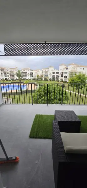 Stunning fully renovated apartment located in the luxurious Hacienda Riquelme Golf Resort, just 15 minutes from the sea and 20 minutes from the city of Murcia. This apartment offers many highlights: a spacious south-west facing terrace with views of the pool, golf course and gardens, bright bedrooms where you can enjoy breathtaking sunrises, and a large main terrace perfect for admiring the soft pink hues of the sunset. Everything has been tastefully renovated in a modern yet warm style, and absolutely everything is brand new: Fully equipped kitchen with osmosis system, oven, induction hob, fridge, dishwasher, washing machine, and coffee machine, 3 brand new TVs still wrapped in plastic, Beds with built-in storage compartments for extra practicality. The apartment also enjoys an ideal location within the resort, just steps away from the supermarket, restaurant, and ATM. The restaurant serves breakfast, lunch, and dinner 365 days a year, even on Christmas Day and New Year’s Eve. The apartment is sold fully furnished and decorated, ready to move in — just bring your suitcases! A golden opportunity not to be missed!