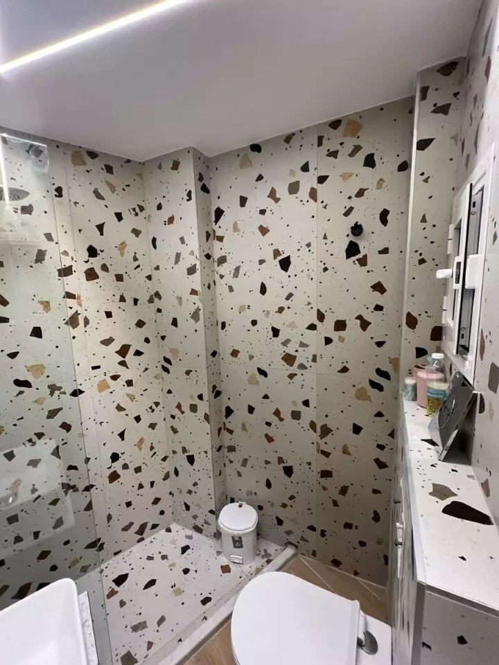 The layout consists of one bedroom, a living room combined with a kitchen, and a shower with a WC. This configuration allows for efficient use of space. The front-facing design provides a view of the city from the windows.