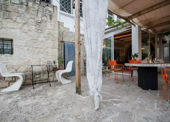 Outside, you’ll find a swimming pool that’s 40.85 square meters. It’s surrounded by an area finished with industrial concrete. Access to the pool area is via a marble staircase that leads down from the paved central courtyard of the older buildings.