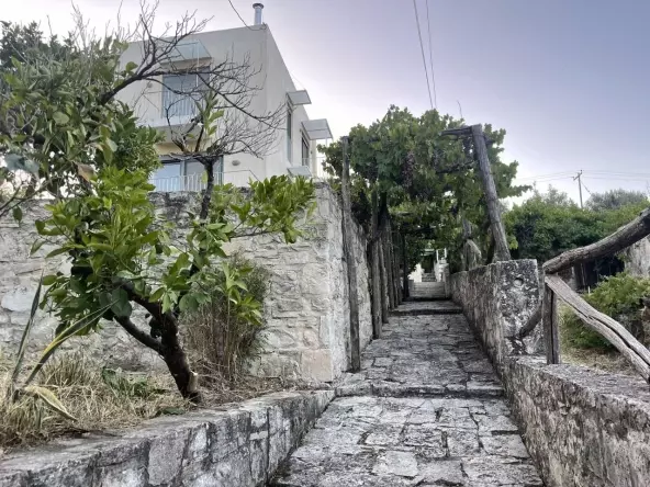 The plot has a noticeable slope and is bordered by stone walls. It’s home to various fruit trees. On the north side, you’ll find olive trees, though this area isn’t fenced.