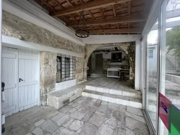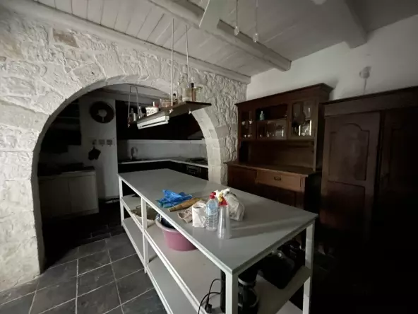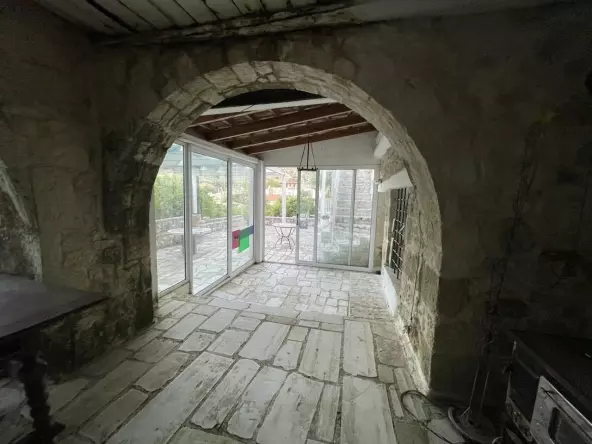 There’s also a first-floor addition above the original 1923 section. This space covers 56.14 square meters. It’s an open-plan area with a living room and two WCs. To get to this part, you’ll use an entrance from the central area that’s enclosed by stone walls.