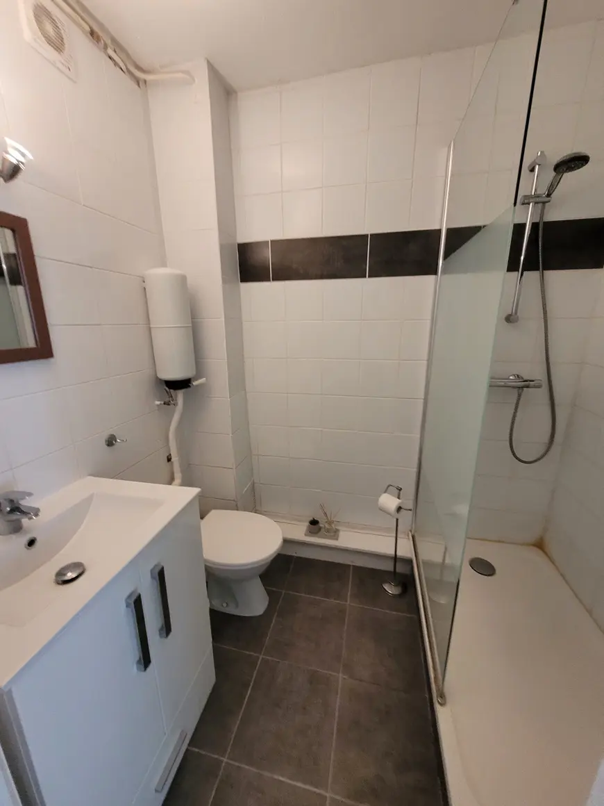 1st=Access via a 9.8 m2 mezzanine/3rd bedroom with double sofa bed and dresser + a 9.2 m2 fully furnished living room with double French doors onto balcony with recently renovated wooden shutters + a 1.8 m2 hall with walk in storage room + a 3.8 m2 shower room (wc, walk in shower, washbasin and cupboard) + a 9.8 m2 bedroom with double bed, wardrobe, dresser and French doors onto balcony with recently renovated shutters + a 9 m2 bedroom with double bed and dresser.