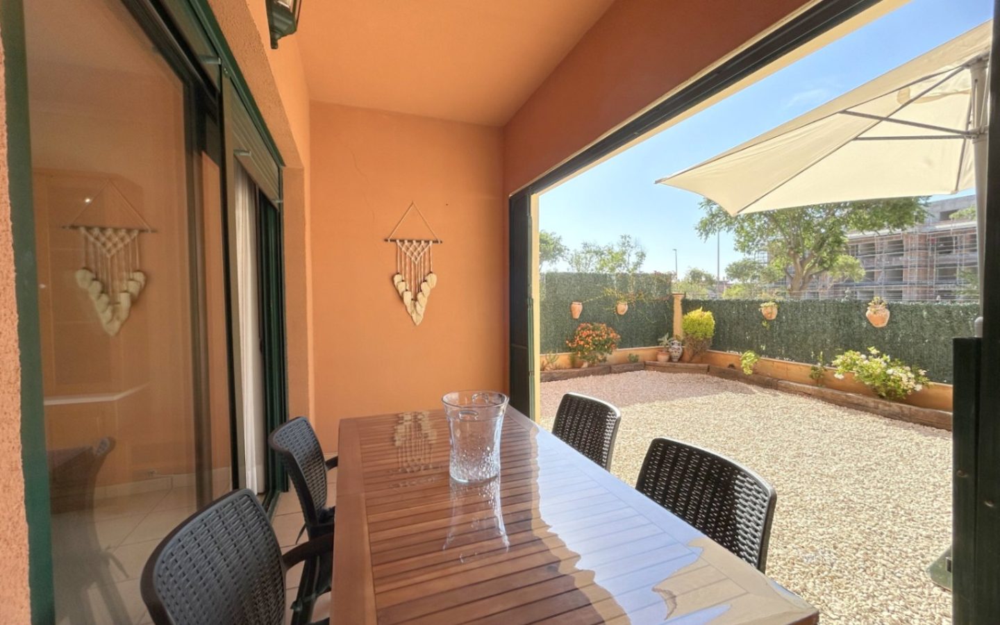 The property, which is a ground floor, consists of three bedrooms with fitted wardrobes, two bathrooms with bathtubs (one en-suite), a fully equipped independent kitchen, a living-dining room, and a large terrace with an outdoor garden. South-facing, very bright, and ideal for the winter months. Urbanization with garden and communal pool.