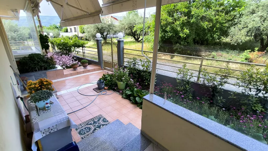 This flat features a double-frontage layout, which allows for views of the city and the mountains from its windows. Such a layout can contribute to natural light and a more open atmosphere. In terms of amenities, the apartment includes solar panels for water heating, an air conditioning unit for temperature control, and heating for cooler months. It is important to note that awnings are also part of the property, providing options for shade when you need it.
