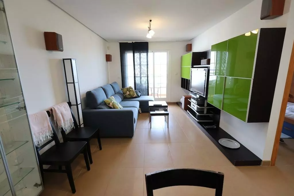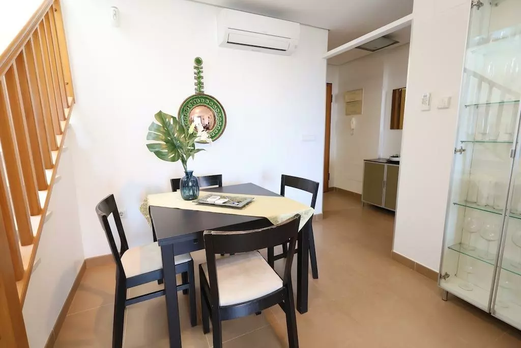 The independent kitchen comes fully equipped, offering functionality for everyday cooking. The living-dining area is bright and includes direct access to a spacious terrace. From the terrace, residents can enjoy views of the sea, gardens, and the communal pool, making it an ideal space for outdoor dining or relaxation.