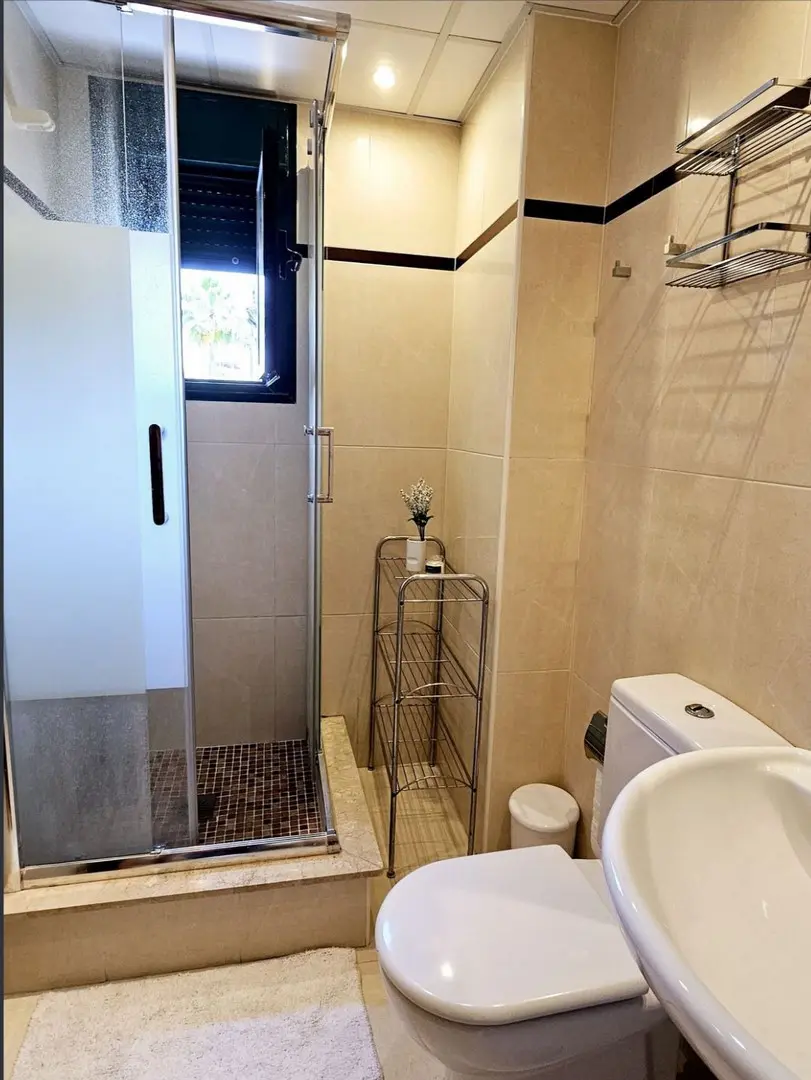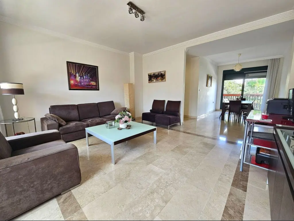 Covering a built area of 128 m², the apartment includes an entrance hall, a spacious living room with access to a large balcony that overlooks the communal pool, and a separate dining room adjacent to a second terrace. The kitchen is independent and includes a laundry room for added functionality. The layout also features a master bedroom with an en-suite bathroom, a second bedroom, and an additional full bathroom. Each room is designed to be exterior-facing, contributing to the influx of natural light.