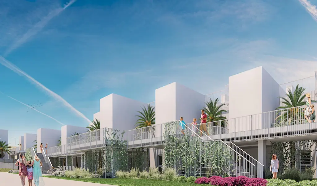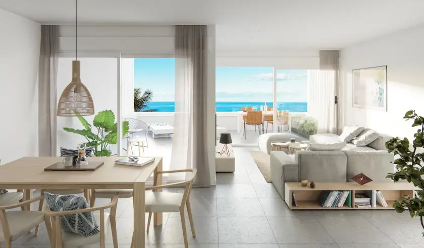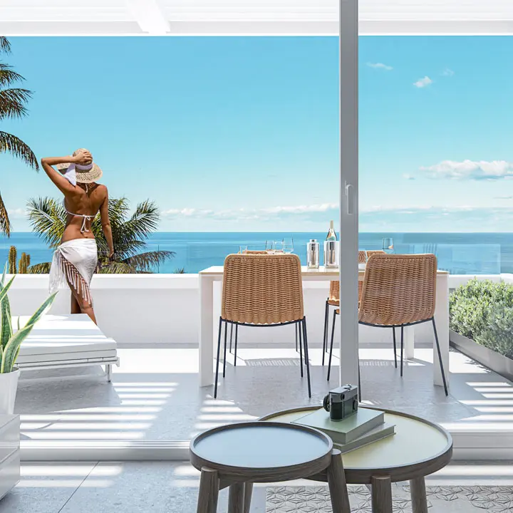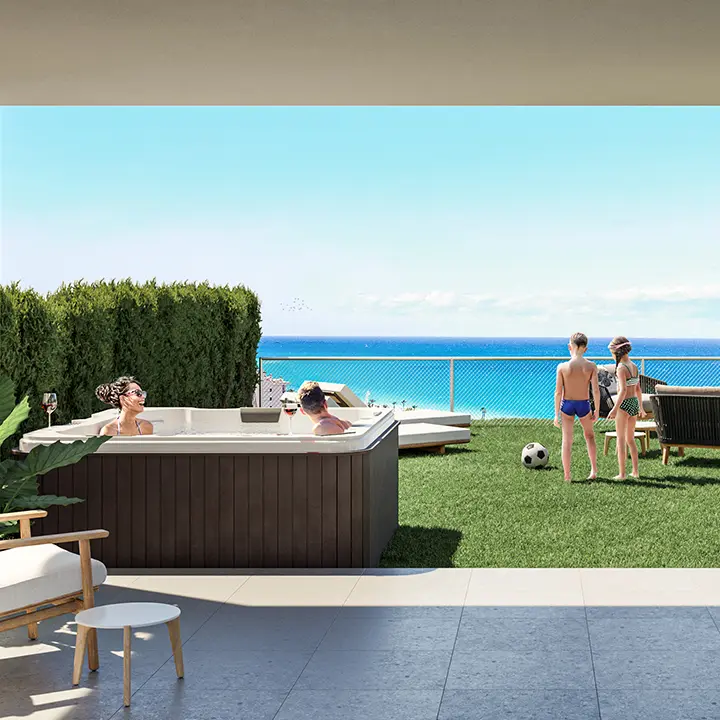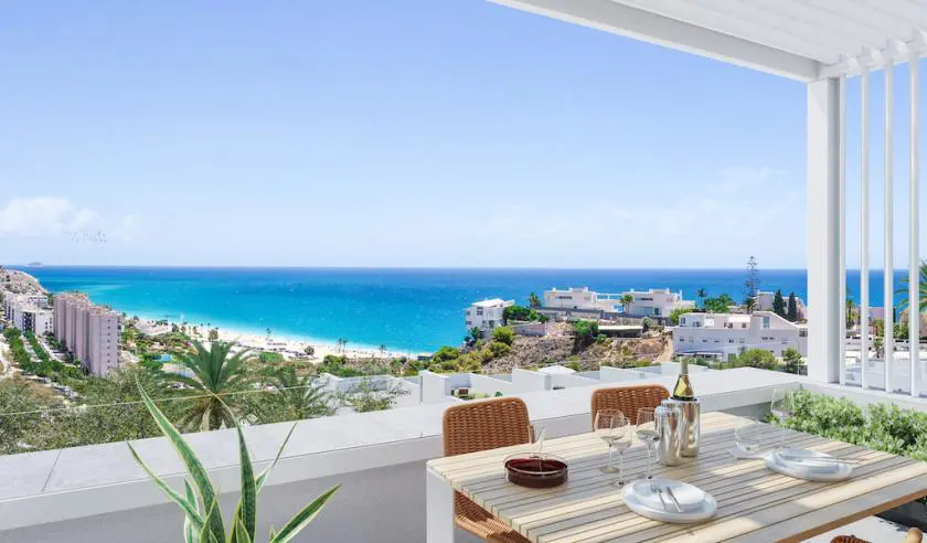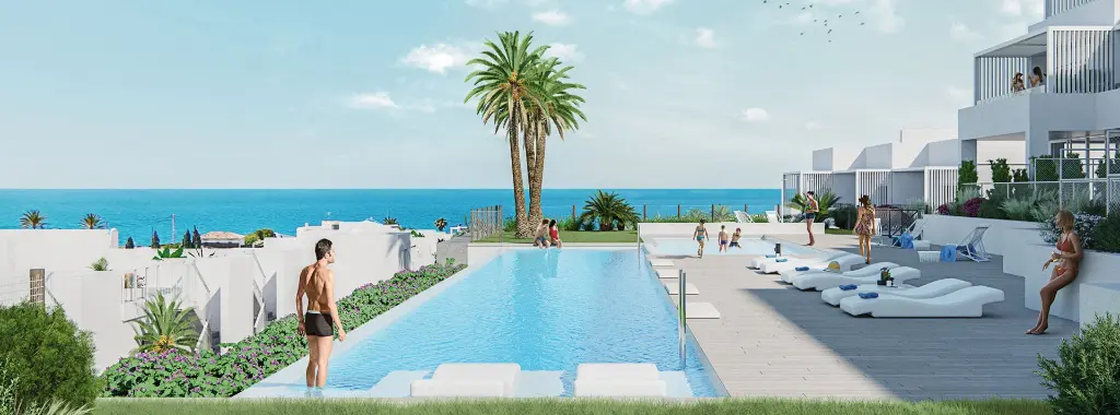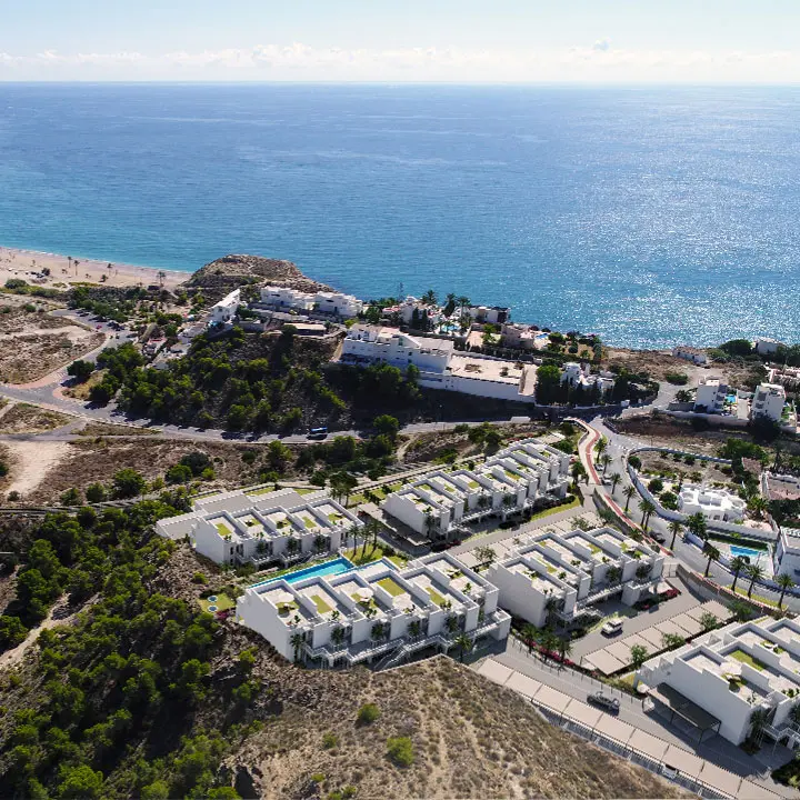 For sale new apartments with panoramic sea views in Costa Blanca, Spain.For sale is a unique project of 66 apartments and houses located just south of Villajoyosa on the Costa Blanca North.Unique for its unbeatable panoramic views and incredible common areas. You can have a relaxing swim all year round while overlooking the Mediterranean Sea, as the pool and jacuzzis are heated. Sports enthusiasts will enjoy a full gym, a paddle court and an enviable environment for practicing water sports. Little ones will have a great time in the children’s play areas in and out of the water.The common areas and residences have beautiful sea views. Depending on the orientation and elevation, you can enjoy views of the common areas, the pool and the various beaches and coves.Houses with 2 and 3 bedrooms, with beautiful sea views. They all have a large terrace, garden or solarium. Excellent qualities that include, among others, hot/cold air conditioning through ducts and underfloor heating in the bathrooms. You have the opportunity to personalize your home with different finishing options. All properties include a parking space.