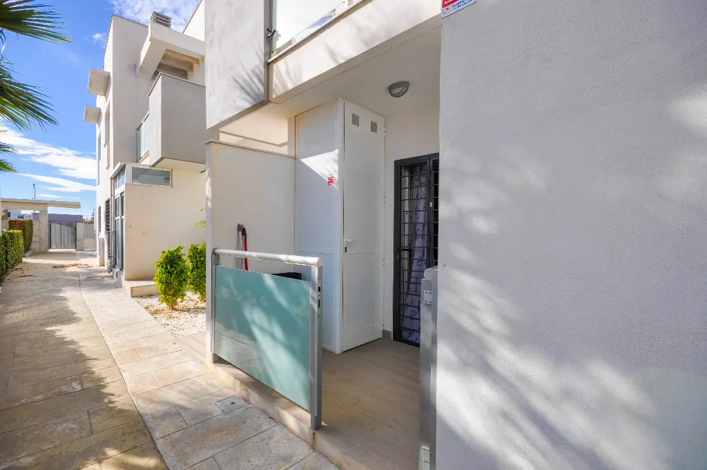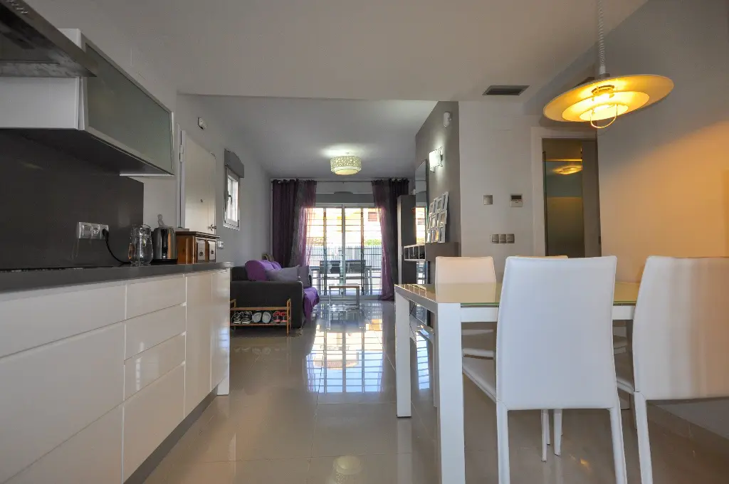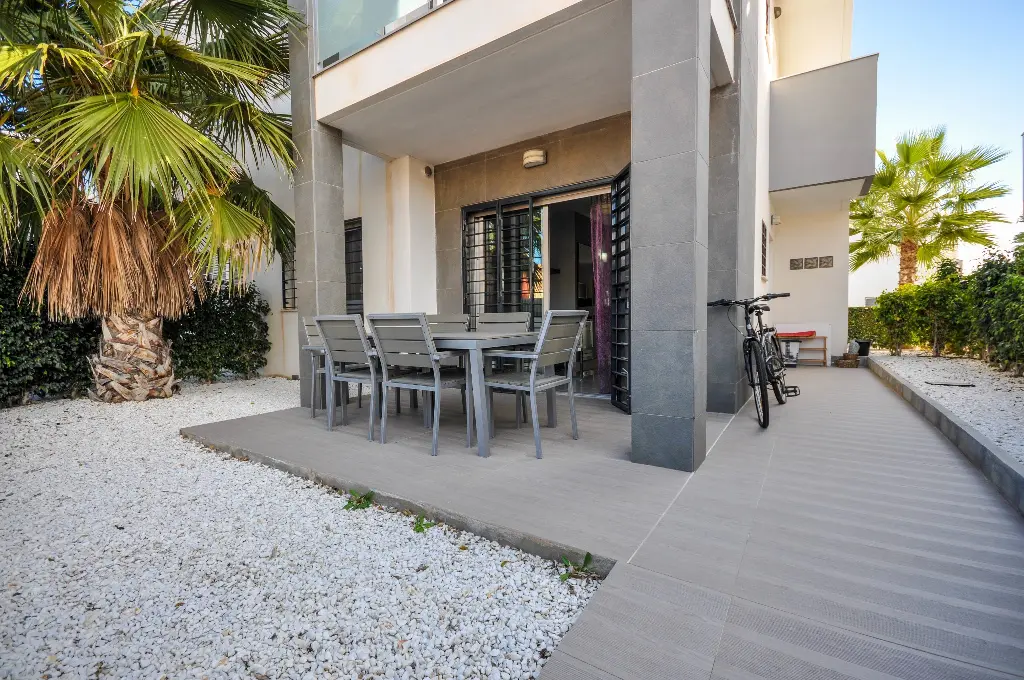 For sale apartment with private garden in ¨Amay¨, Punta PrimaCozy ground floor apartment by the sea in the gated community ¨Amay¨ , Punta Prima. The property has 2 bedrooms, 2 bathrooms, lounge-dining room, open-plan kitchen, with access to a large terrace and a furnished kitchen with access to the patio.The apartment has a private garden of 44 m2 and a parking space. Urbanization has a communal pool with a sauna and green areas. The apartments are located just 15 min walk from the sea and 200 meters from the commercial center ¨ Punta Marina ¨.Punta Prima is a typical Spanish seaside tourist resort, located on the southern Costa Blanca and less than 30 minutes from two international airports, Murcia and Alicante(Spain).The beaches, which are some of the cleanest around and have been awarded Blue Flag status, are complemented by a wonderful promenade with shops, boutiques, bars and restaurants. Orihuela Costa has a Mediterranean climate with 320 days of sunshine a year.