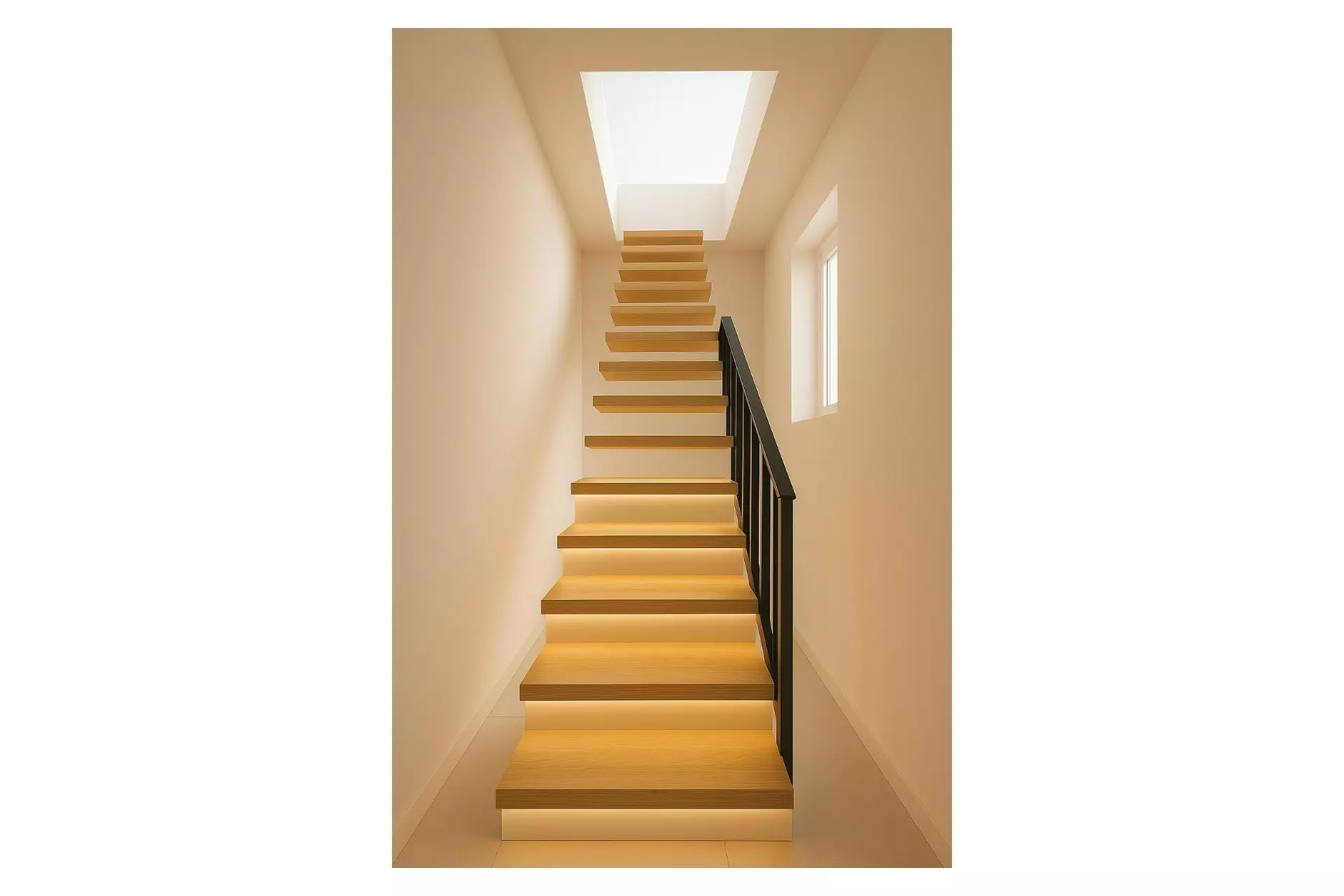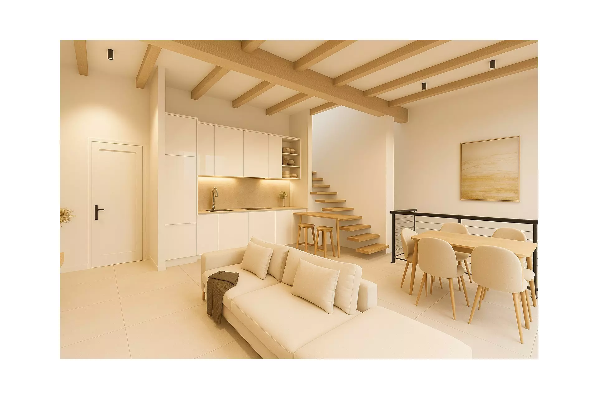 Upon entering the property, a private staircase leads to the main level, where you’ll find a bright two-bedroom, two-bathroom apartment designed in a contemporary style with natural materials. The main area offers an open-plan living-dining-kitchen space of over 30 m², bright and welcoming, with access to a small balcony.