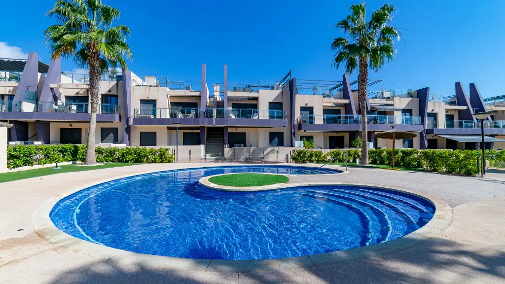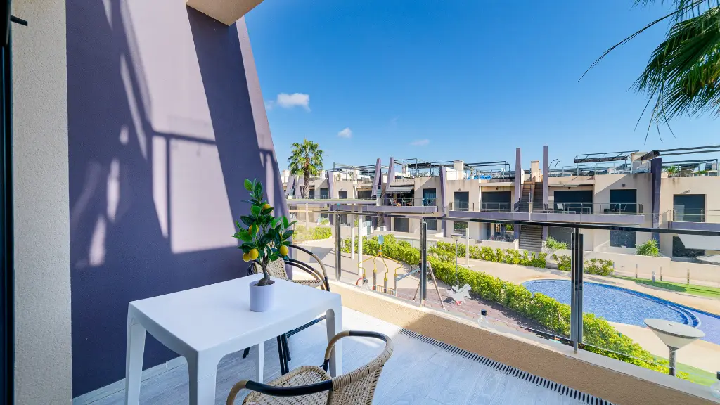 This apartment comprises a front terrace that overlooks the community swimming pool, allowing for a relaxing outdoor space. Inside, there’s a living area that features an open kitchen, providing an inviting space for family and friends. The property includes two bedrooms and two bathrooms, which may suit individuals or small families.